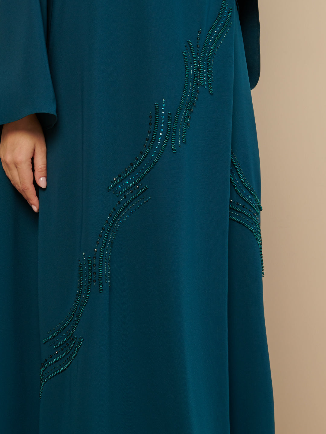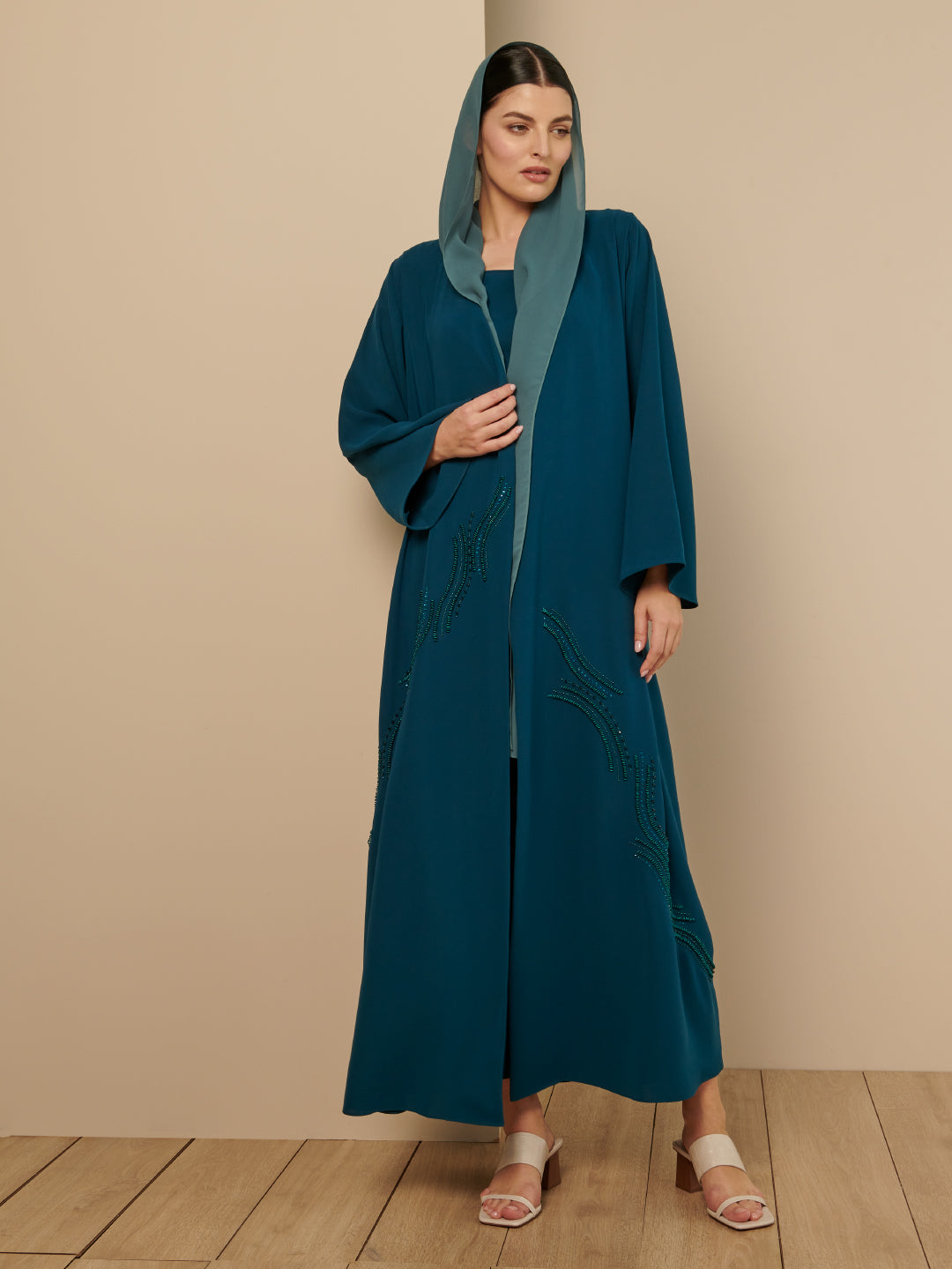 A crepe abaya with 3D lines embroidery the sides paired with Sheila. Other color options available