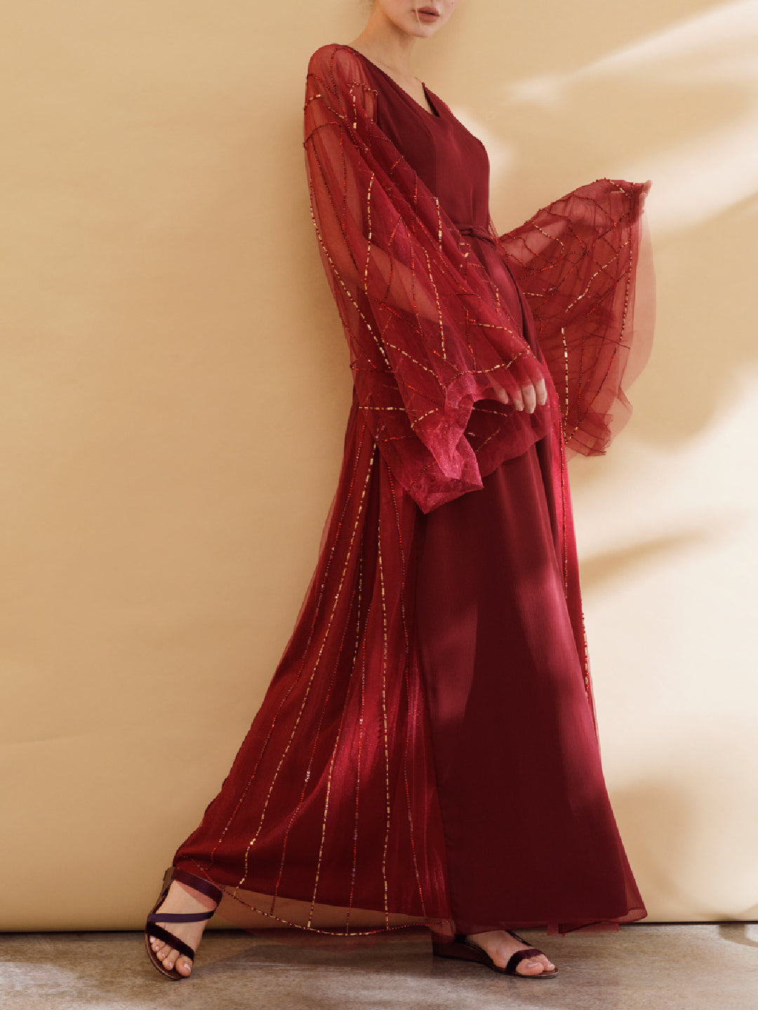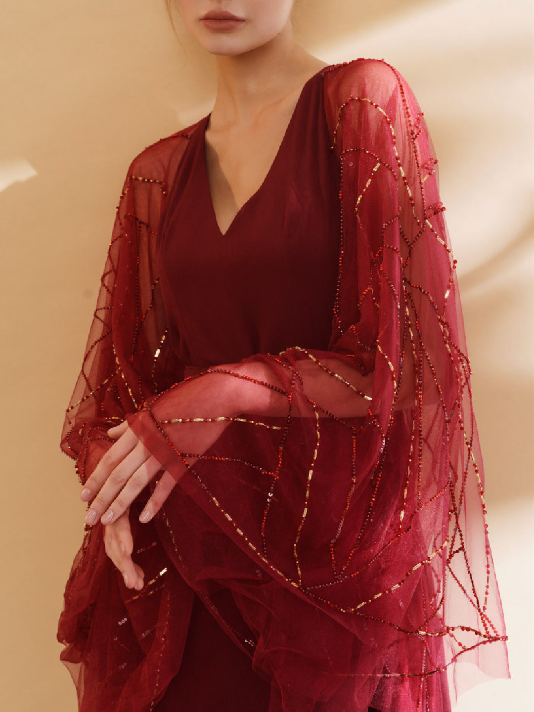 A-line chiffon dress with tulle sleeves and hand-embroidery details.