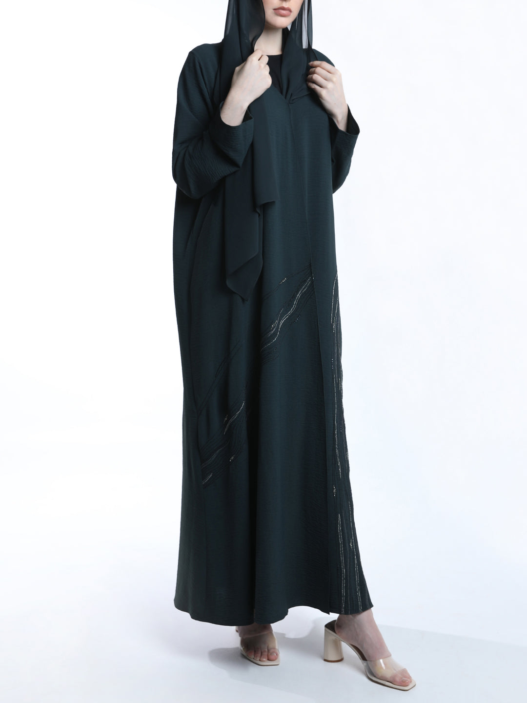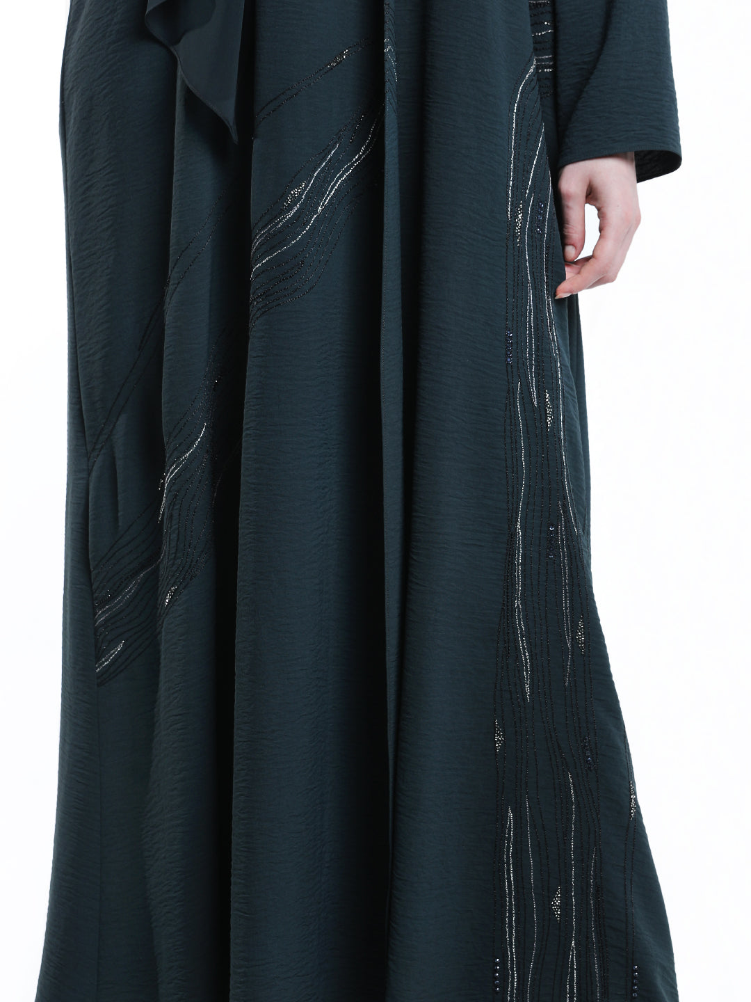 A dark teal green abaya with lines threads embroidery