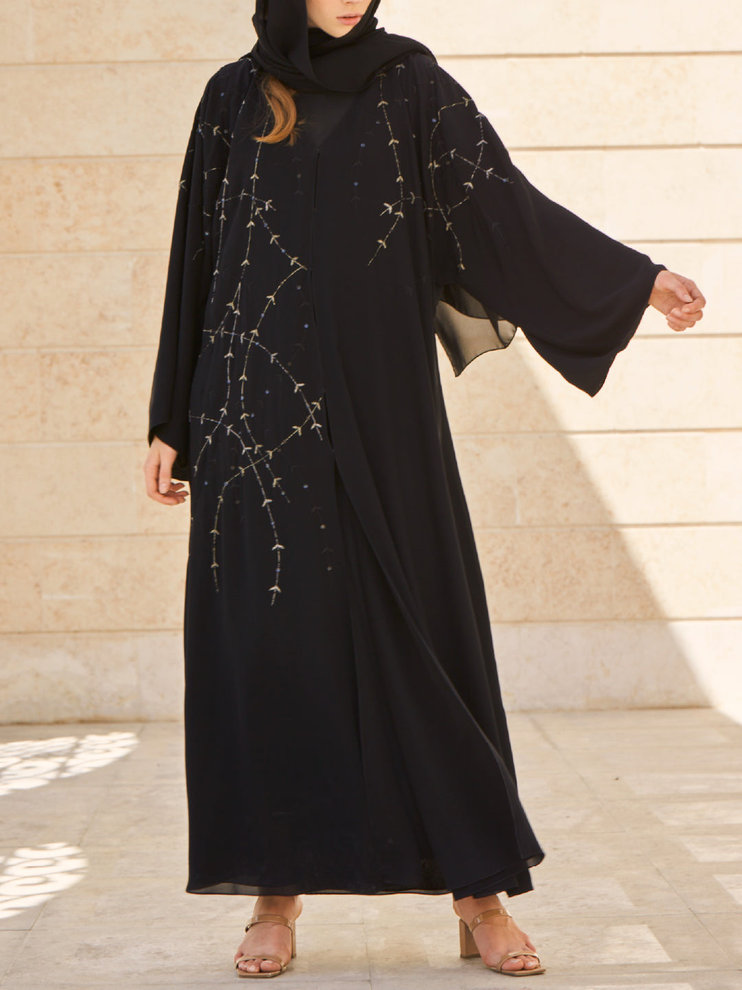 Abaya with leaves threads embroidery
