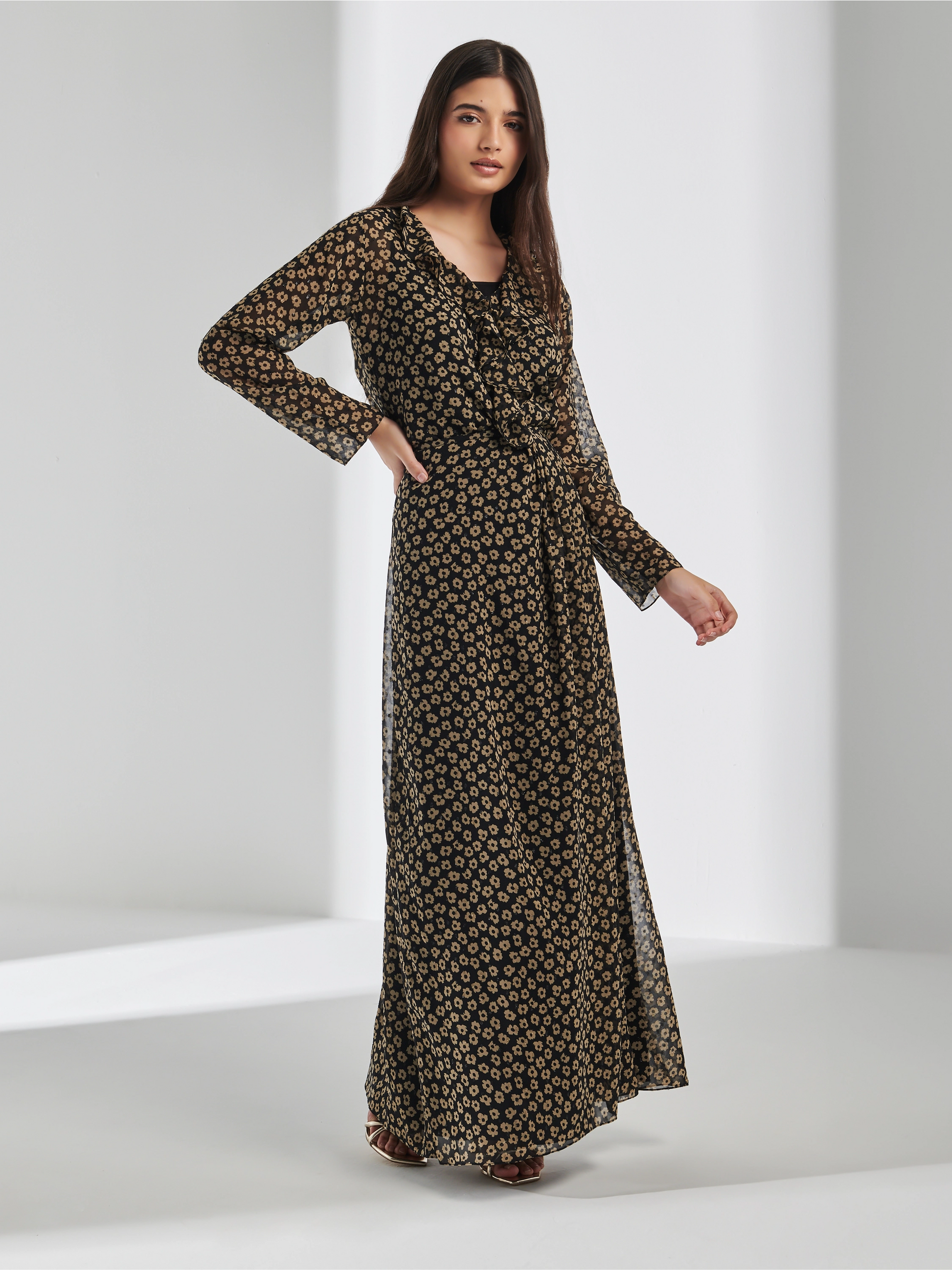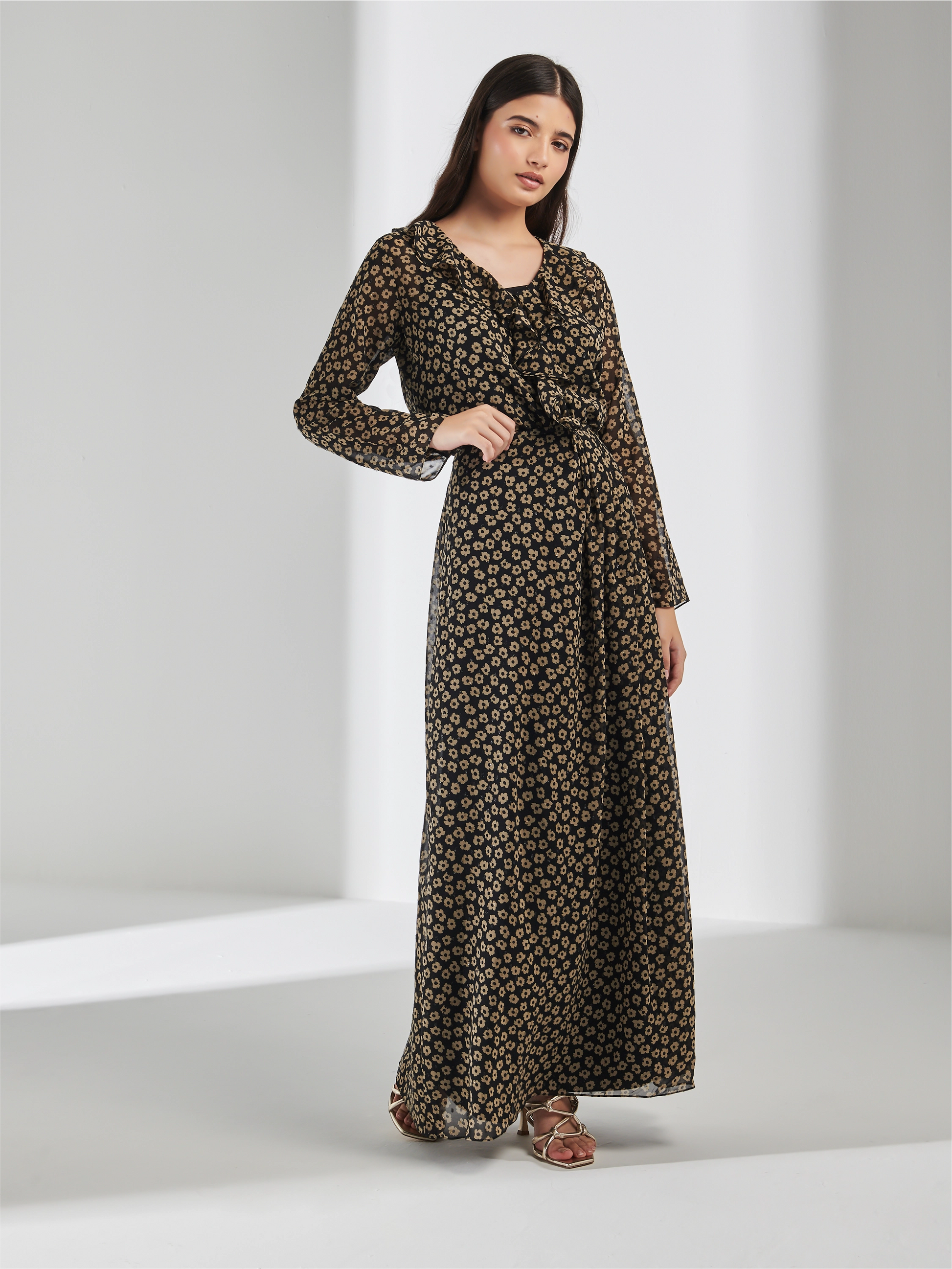 A Japanese chiffon fabric with a floral print and zari details in a matching top and skirt. A matching abaya set is available.