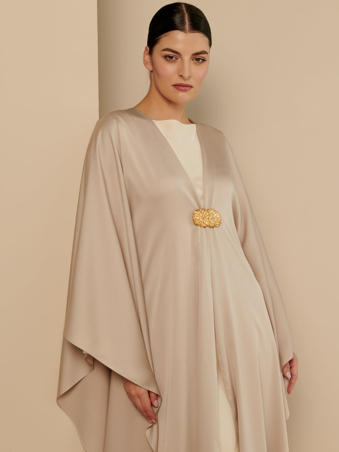 A bone tone silk Abaya with golden buckle. Other color options available