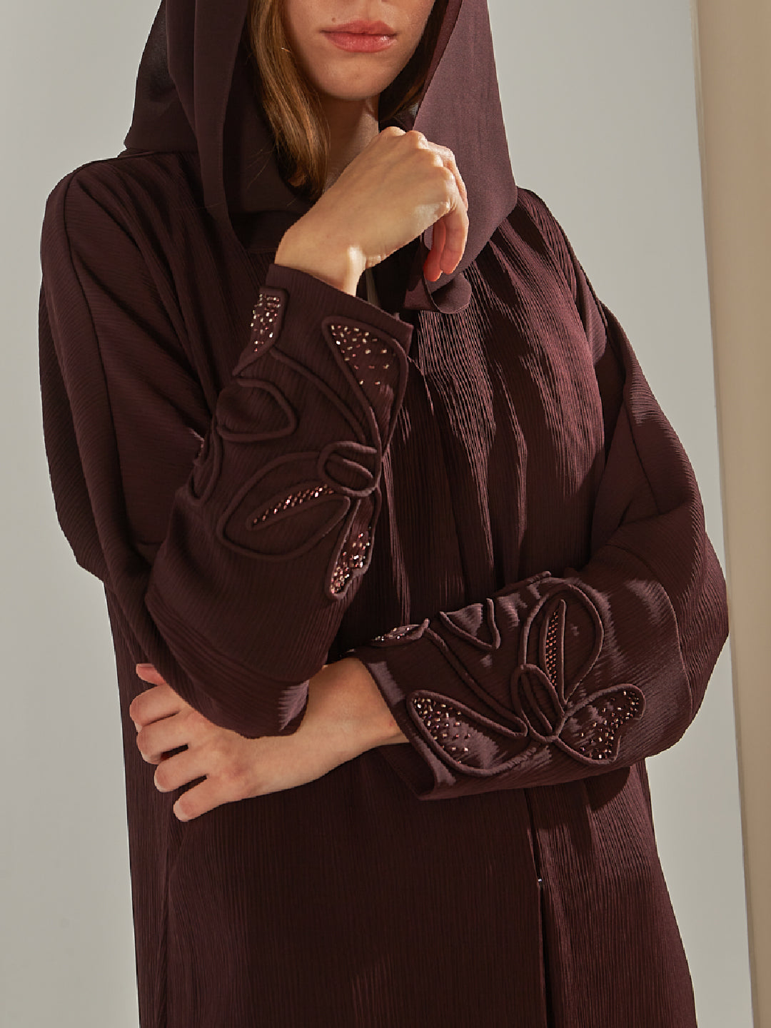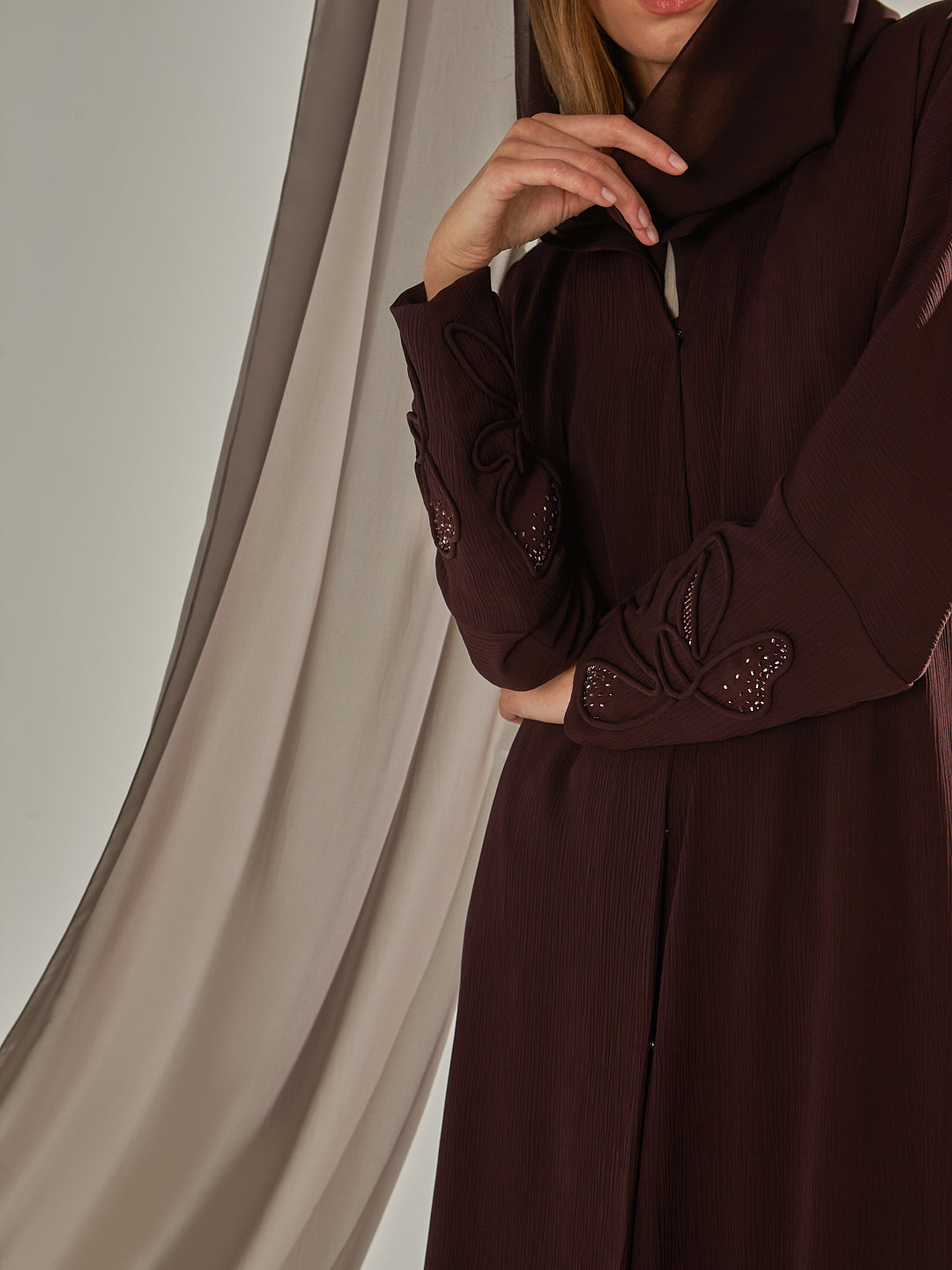 A wrap abaya with hand embroidery of 3D flowers on cuff sleeves