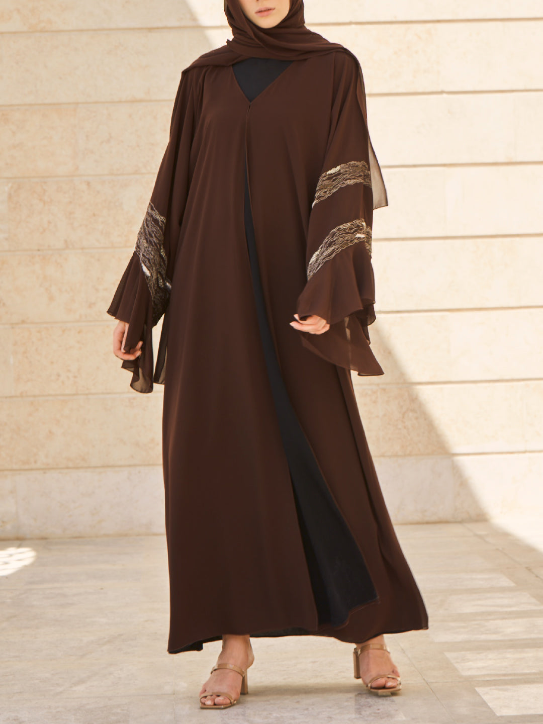 Chiffon Abaya in Brown with ruffle sleeves