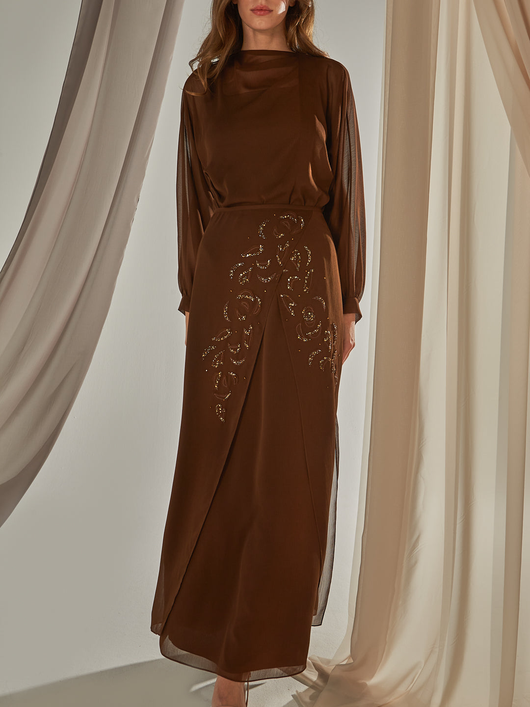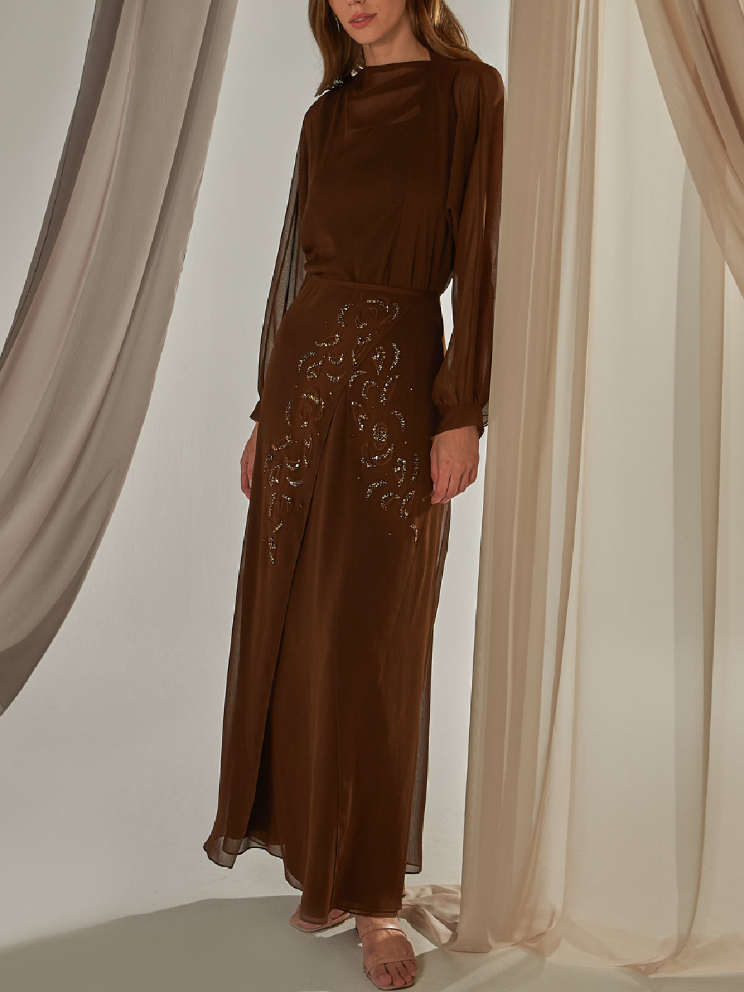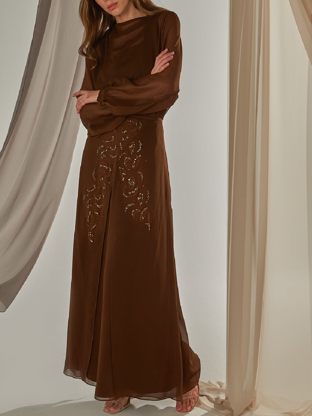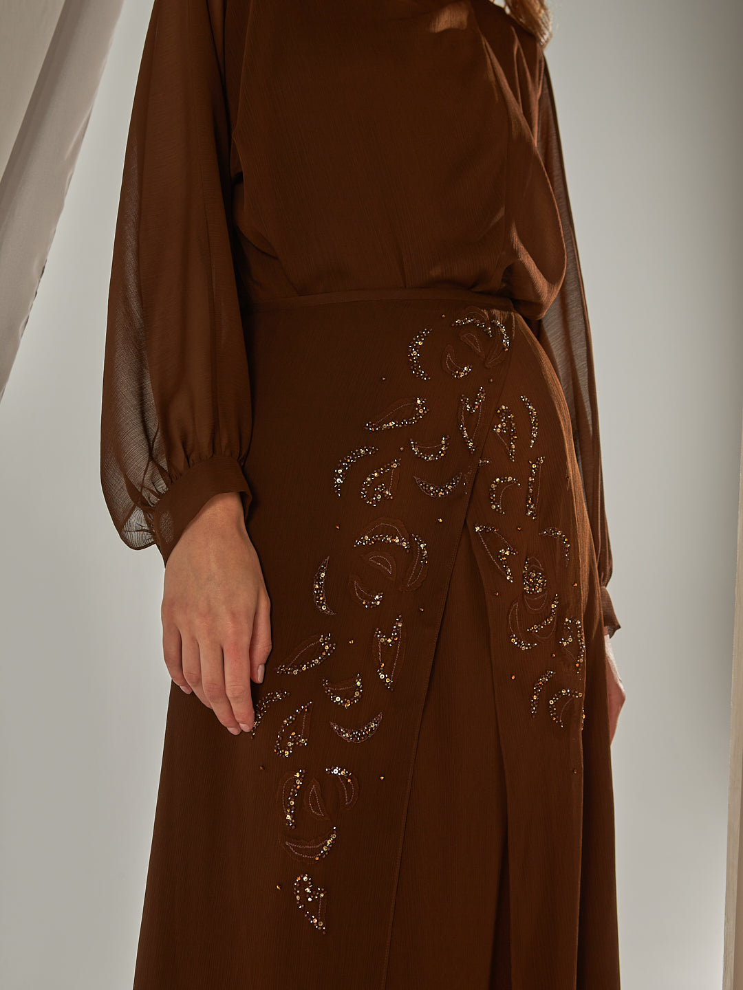 A wrinkled chiffon layered skirt with cutout applique leaves paired with matching blouse