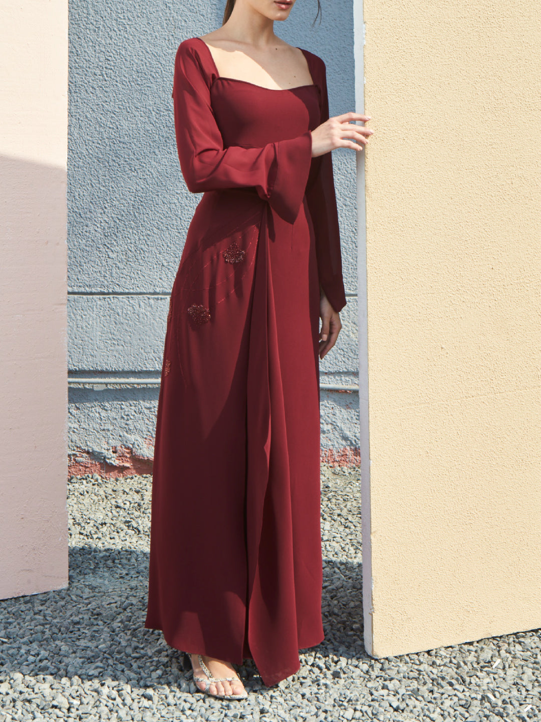 A layered crepe skirt with hand embroidery details paired with a matching top with chiffon sleeves