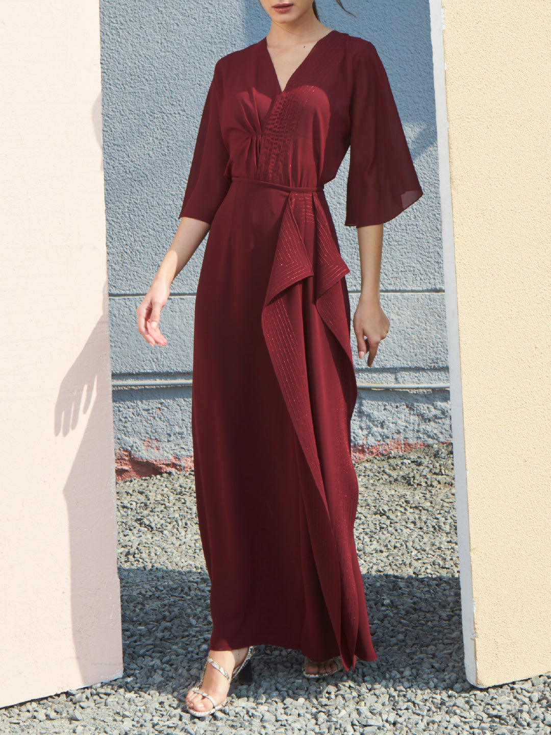 A layered crepe skirt with hand embroidery details paired with a matching top with chiffon sleeves