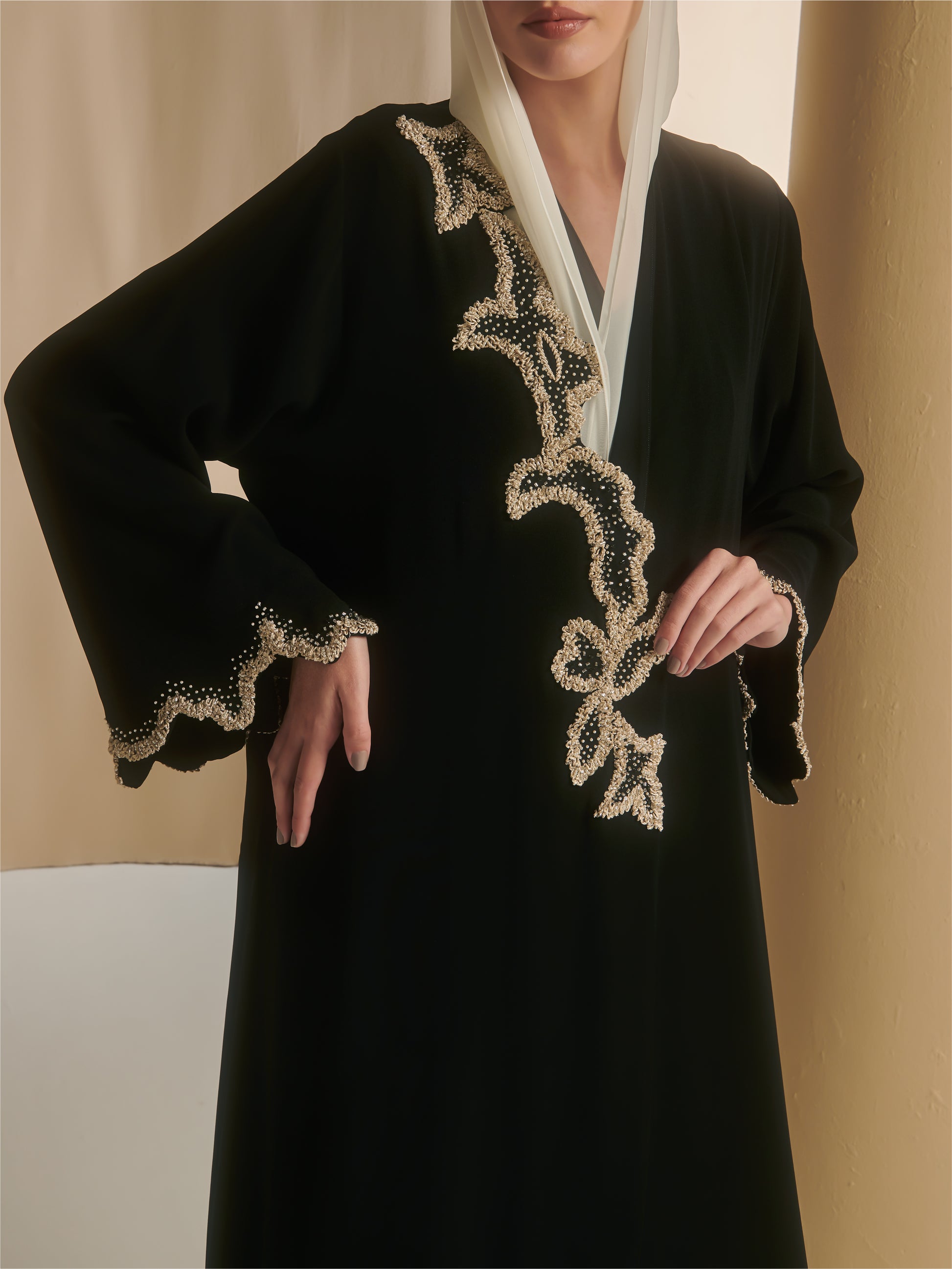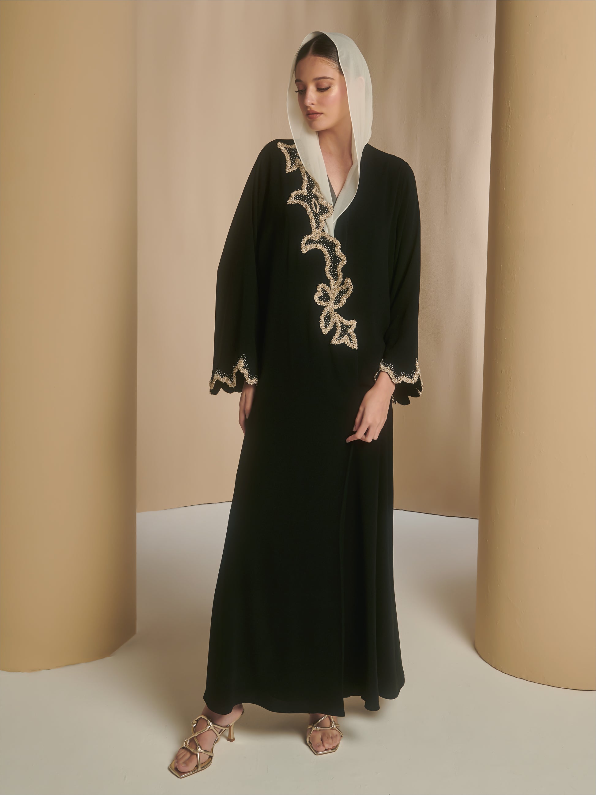 A crepe Abaya with scallop cut panel in front side of the abaya and sleeves with 3D threads embroidery