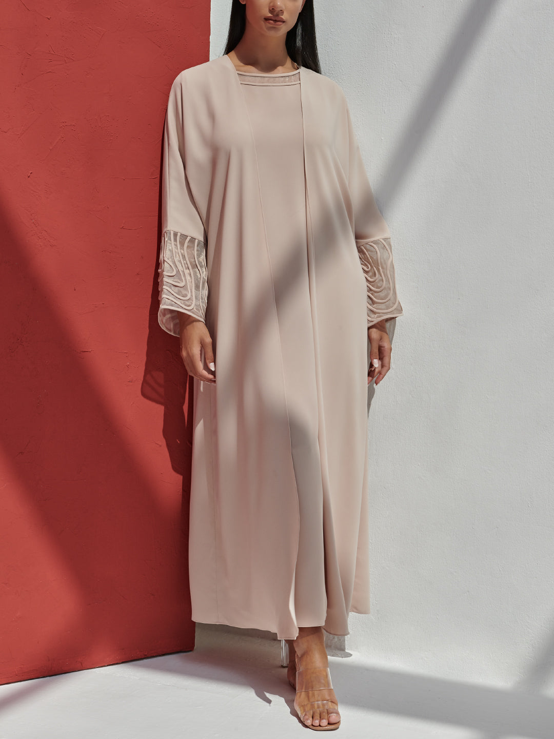 A cardigan set in crepe with organza details and hand embordairy piping paired with an inner dress