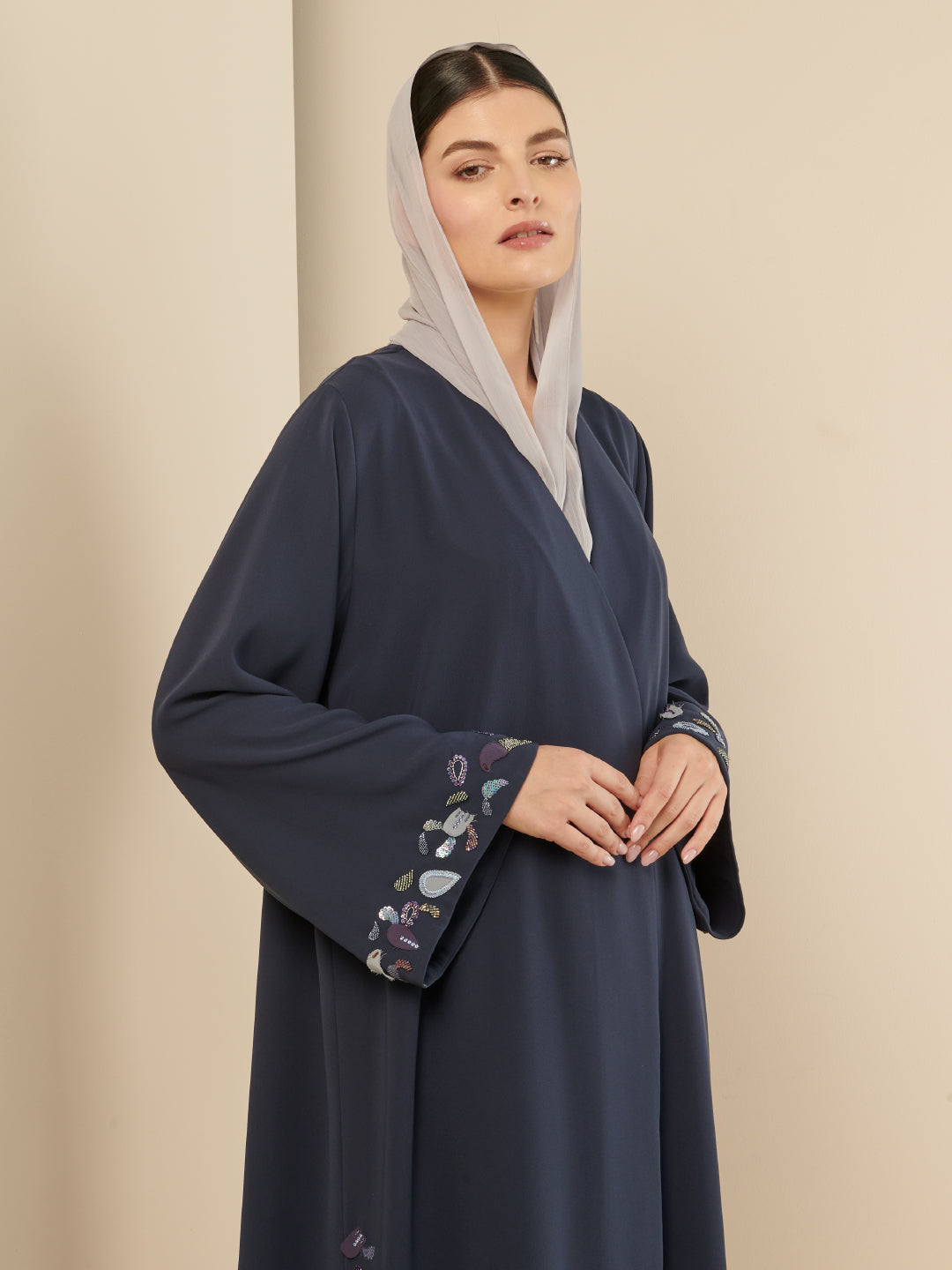 A crepe abaya with cut out abstract embroidery flowers on the sides and sleeves paired with Sheila. Other color options available