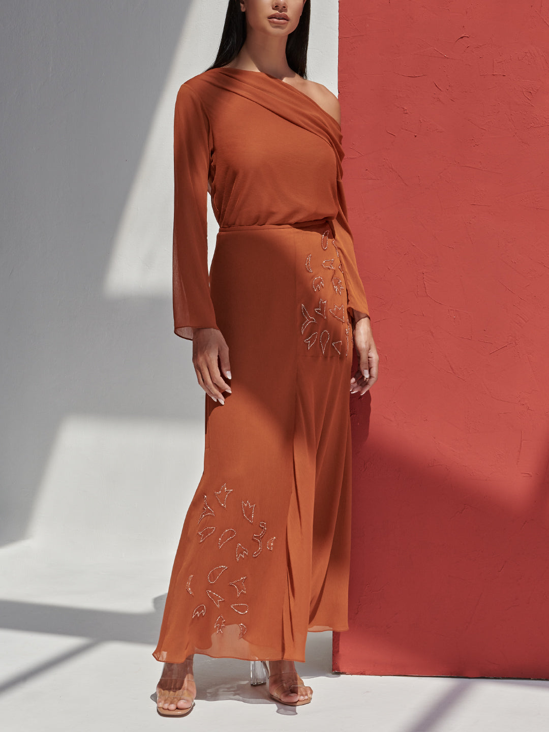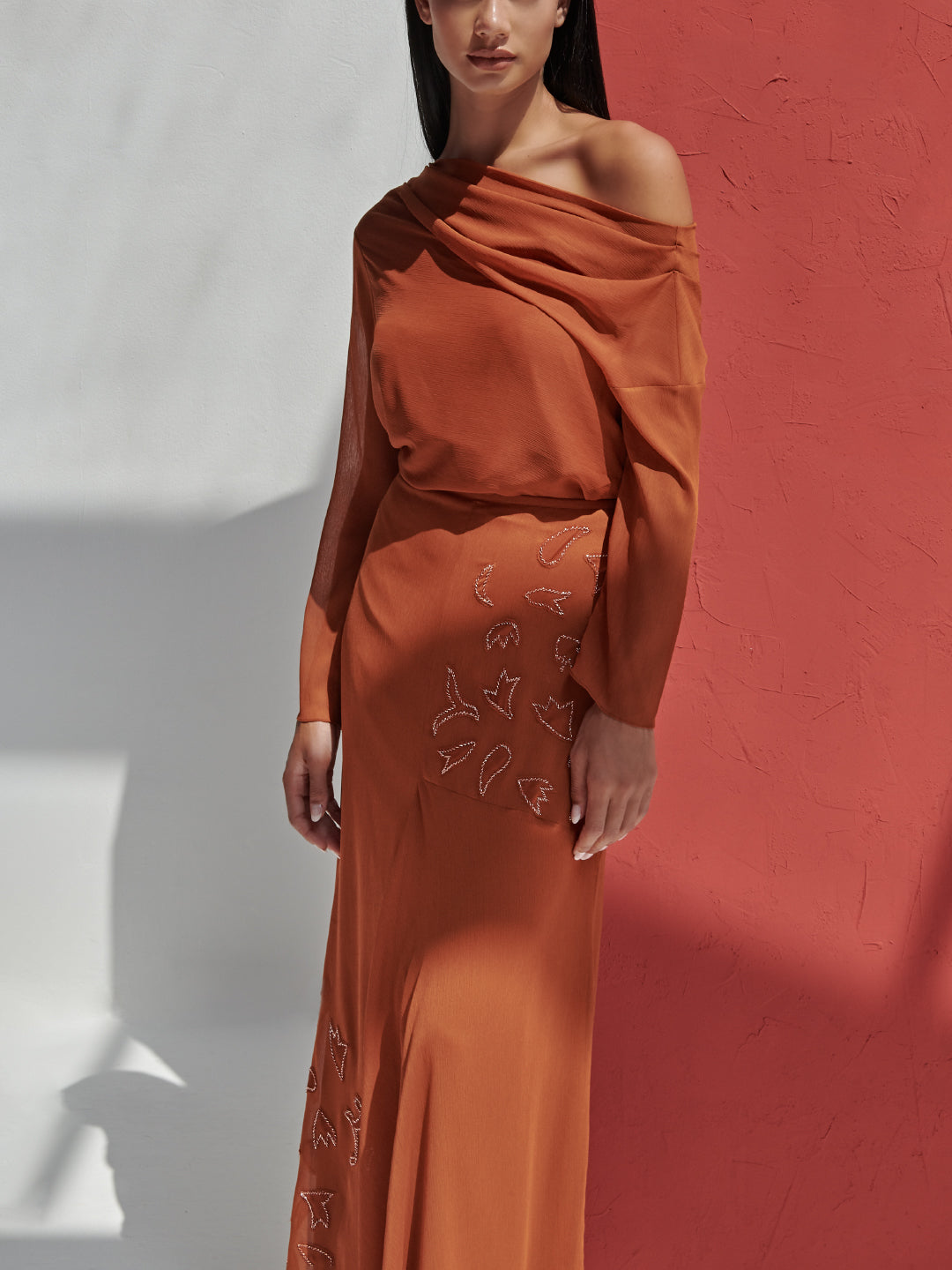 A chiffon draped off shoulder top paired with a matching skirt with a cut out detailed embordairy. Other color option available