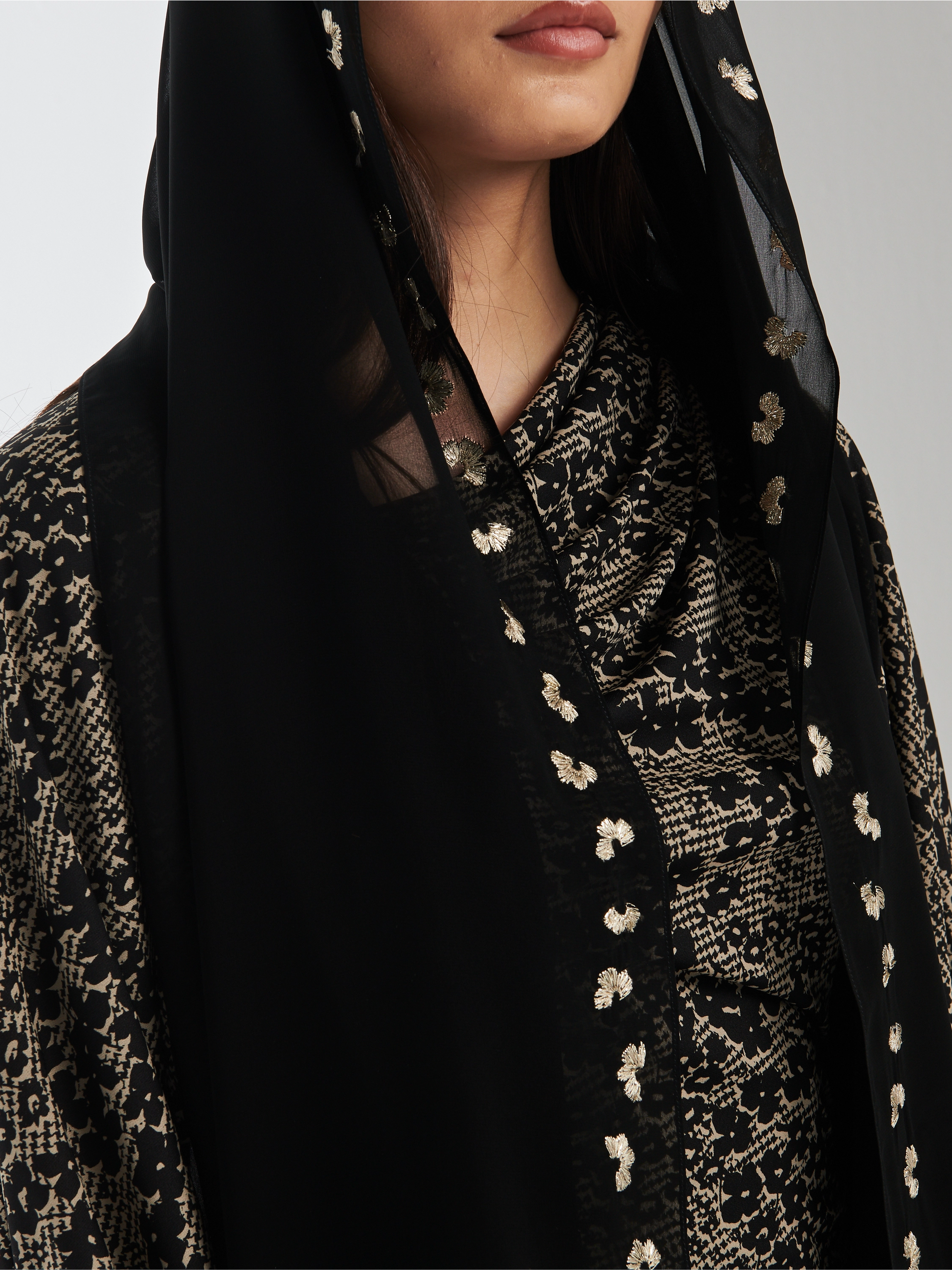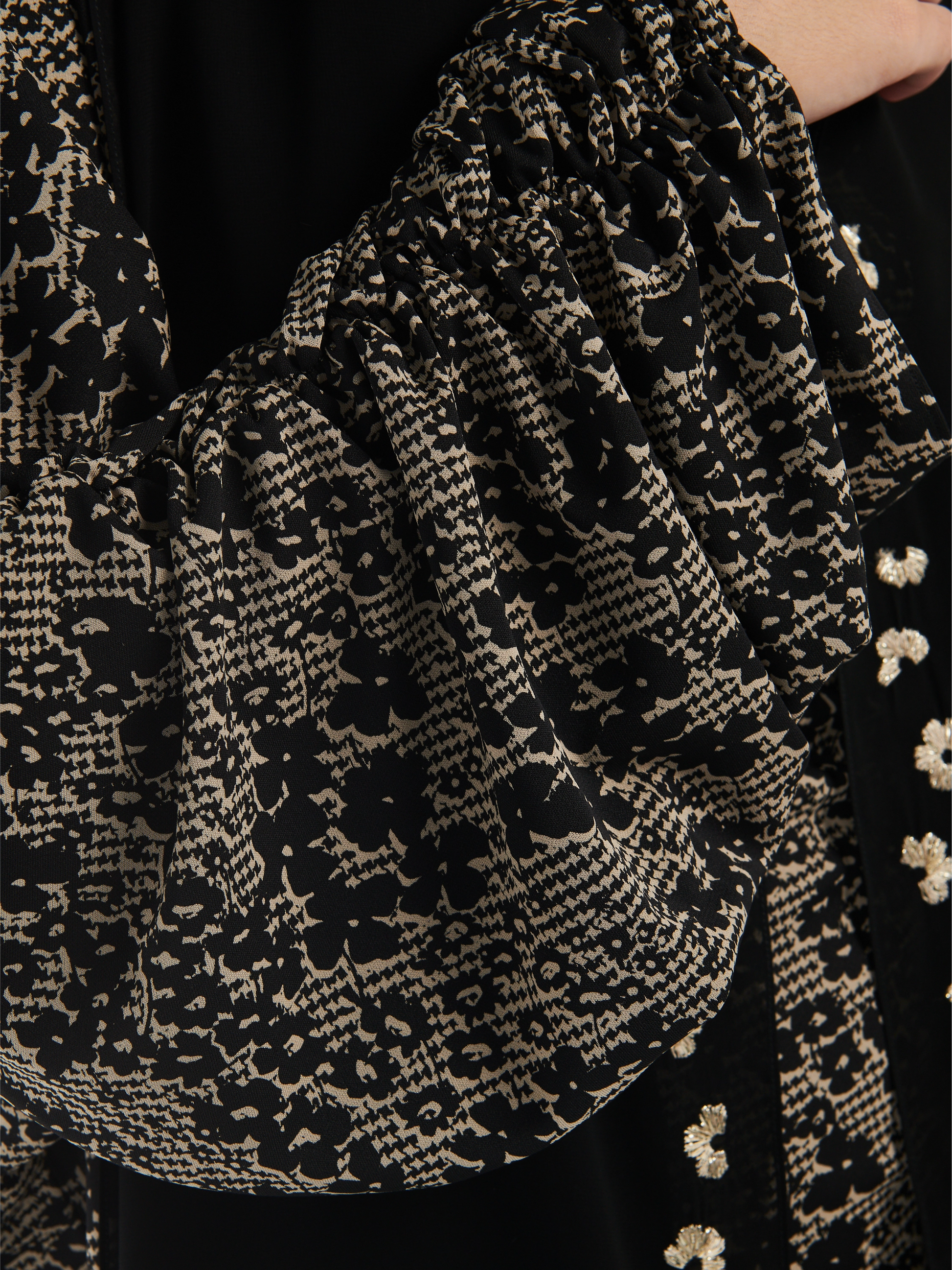 A Japanese jersey fabric with an abstract floral print, hand embroidery details on the Sheila. A matching dress set is available.