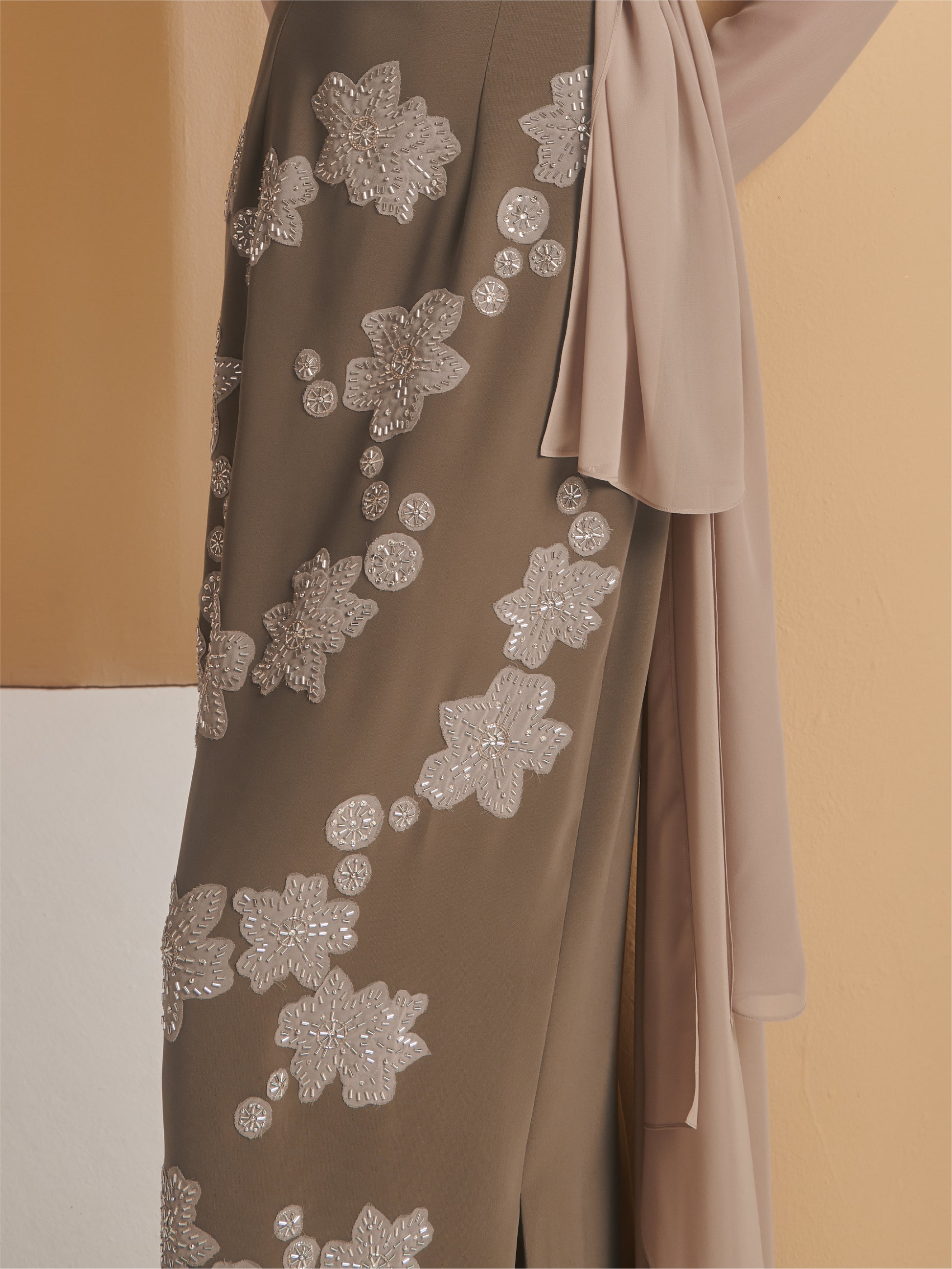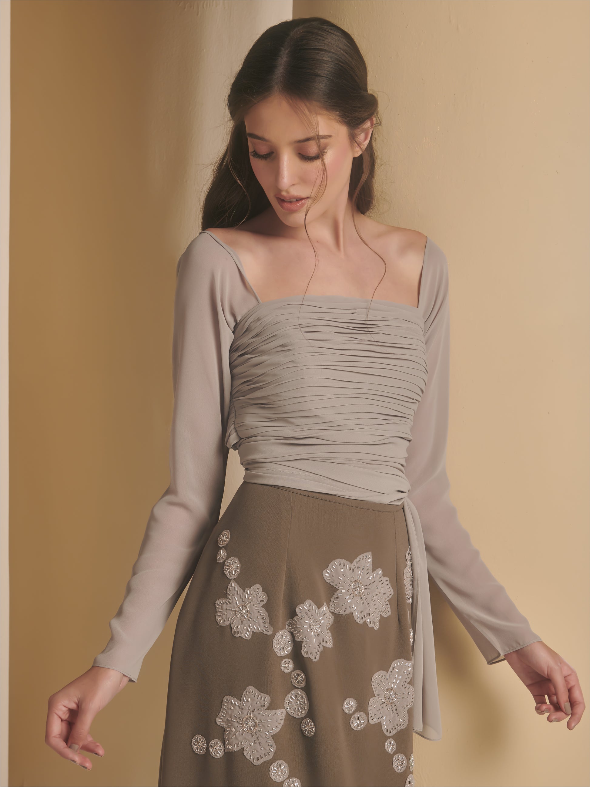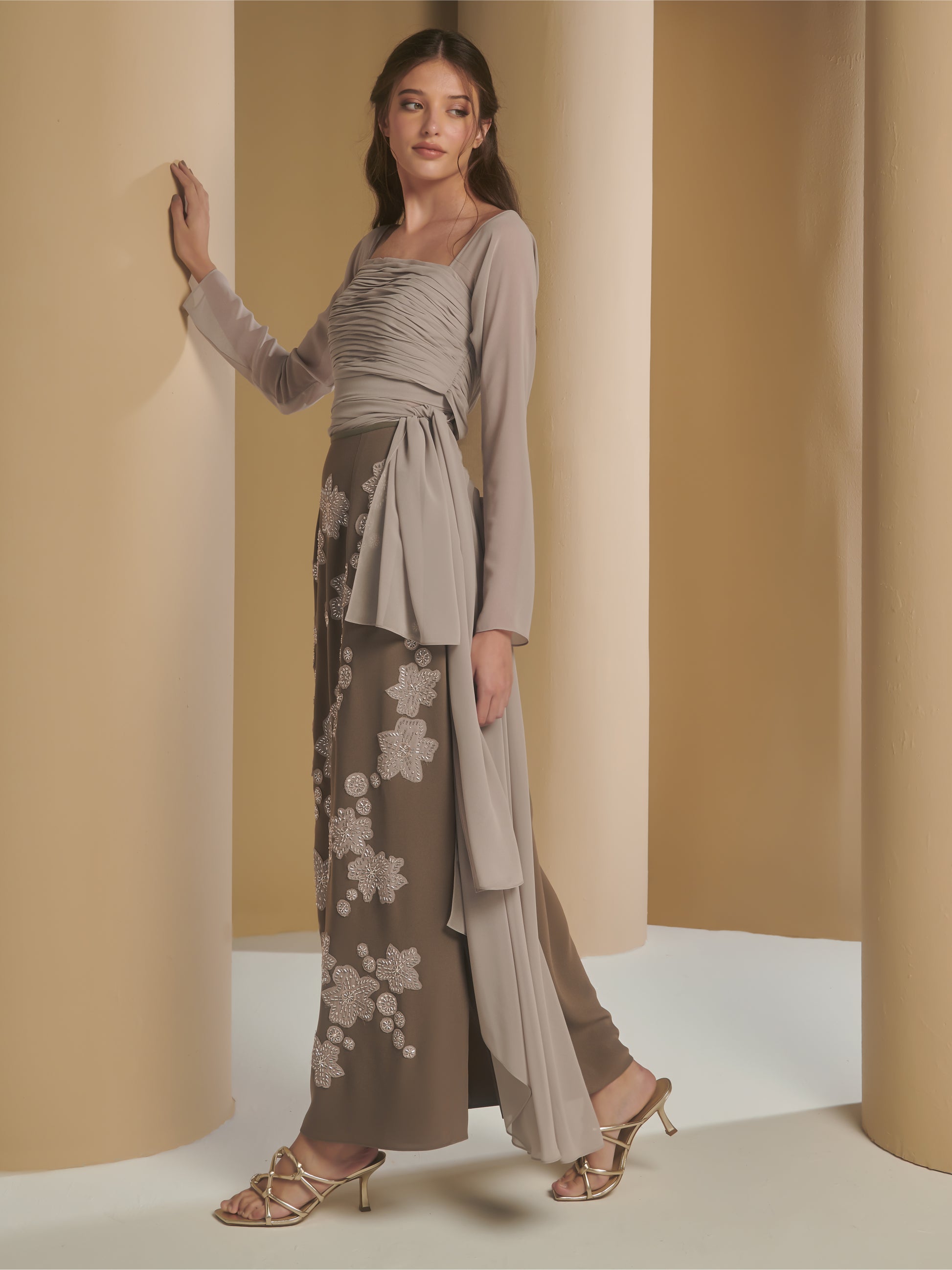 A chiffon draped top paired with a crepe skirt with cutout handmade flowers embroidery