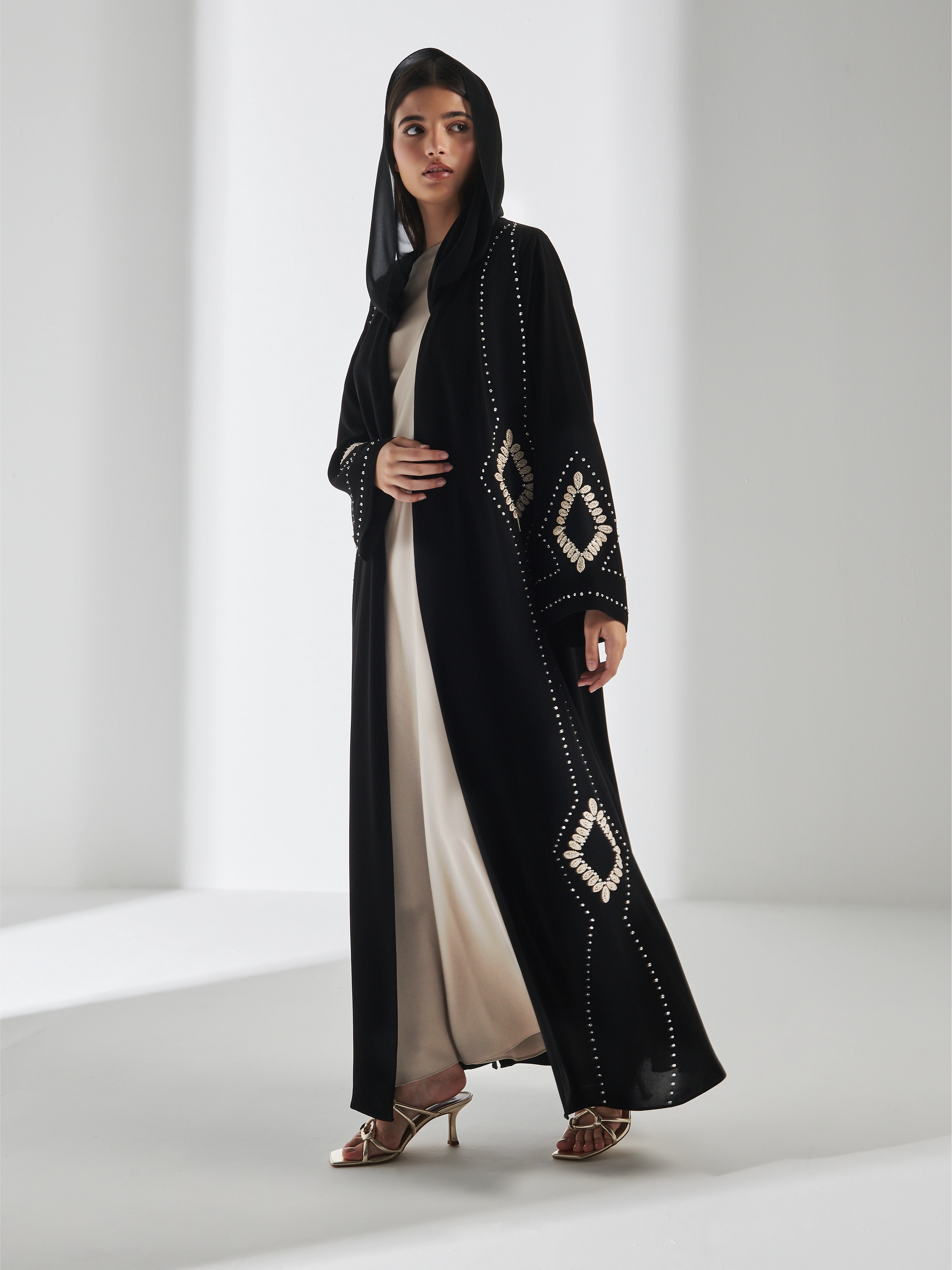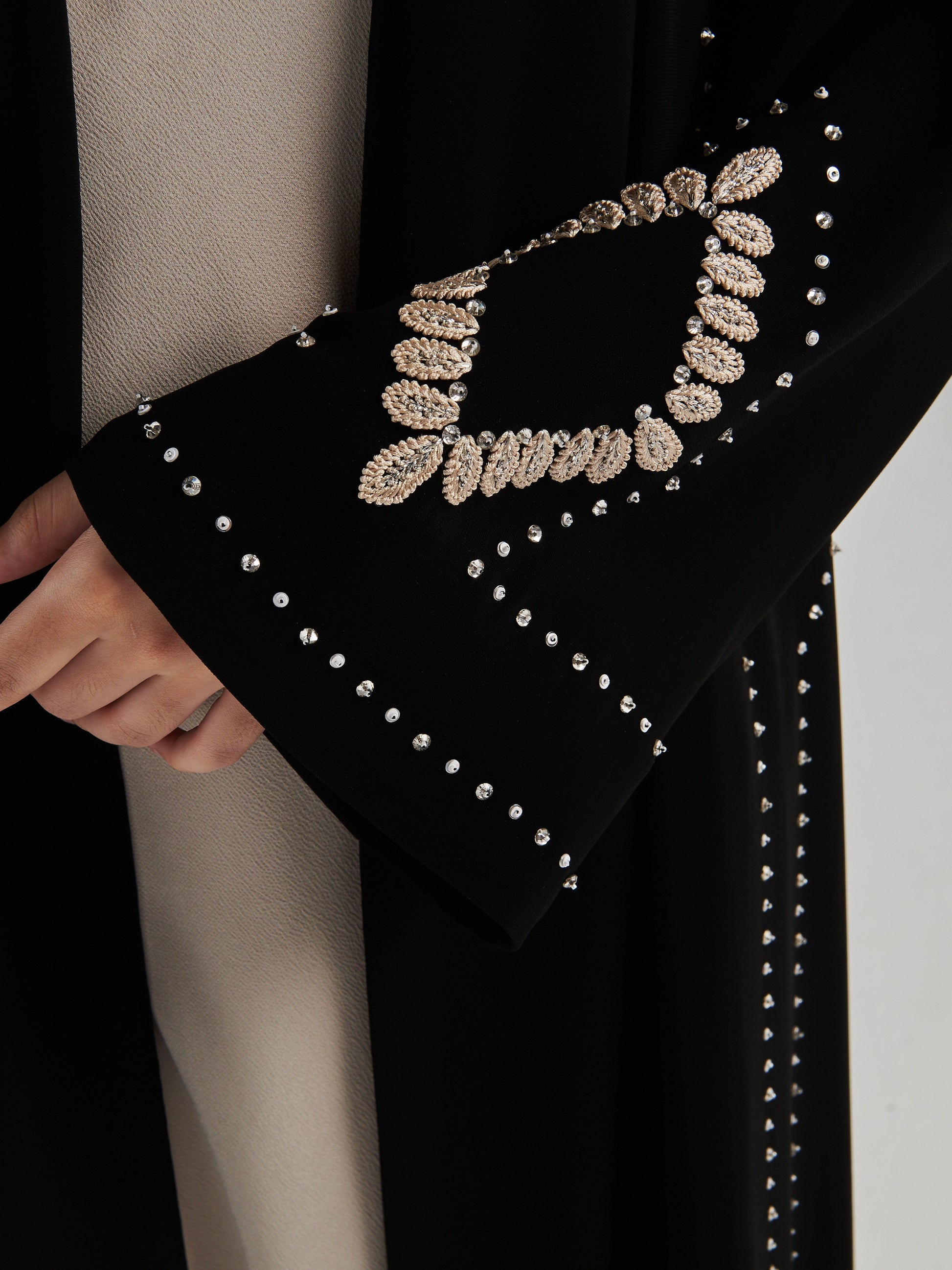 A crepe black abaya with thread hand embroidery details on the sleeves and body. Customized sizes available.