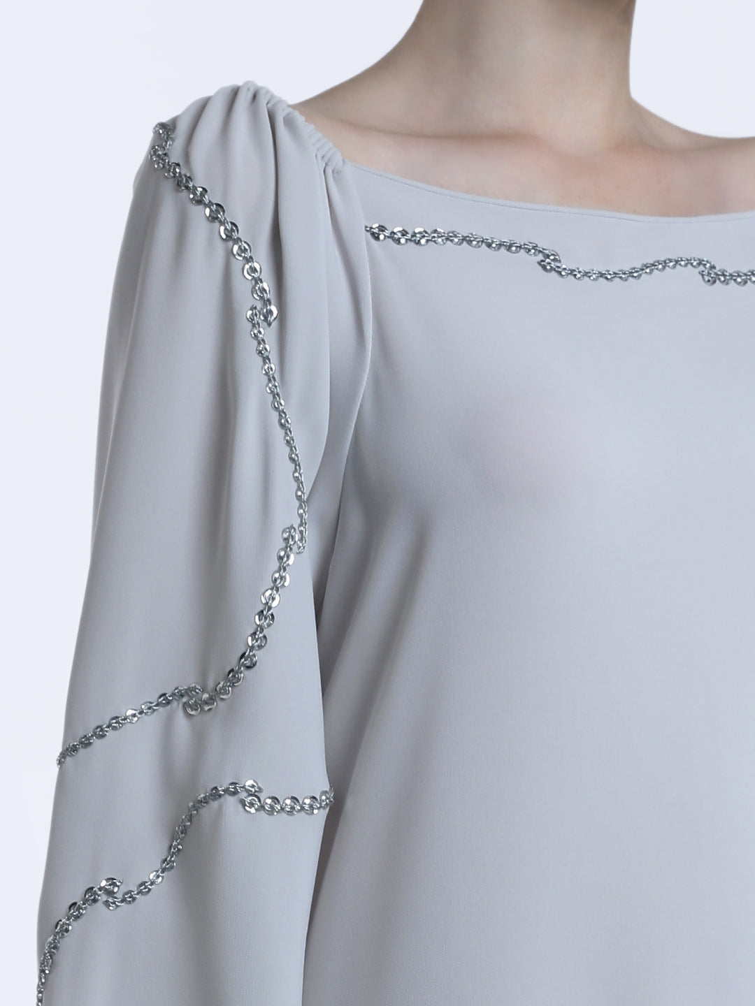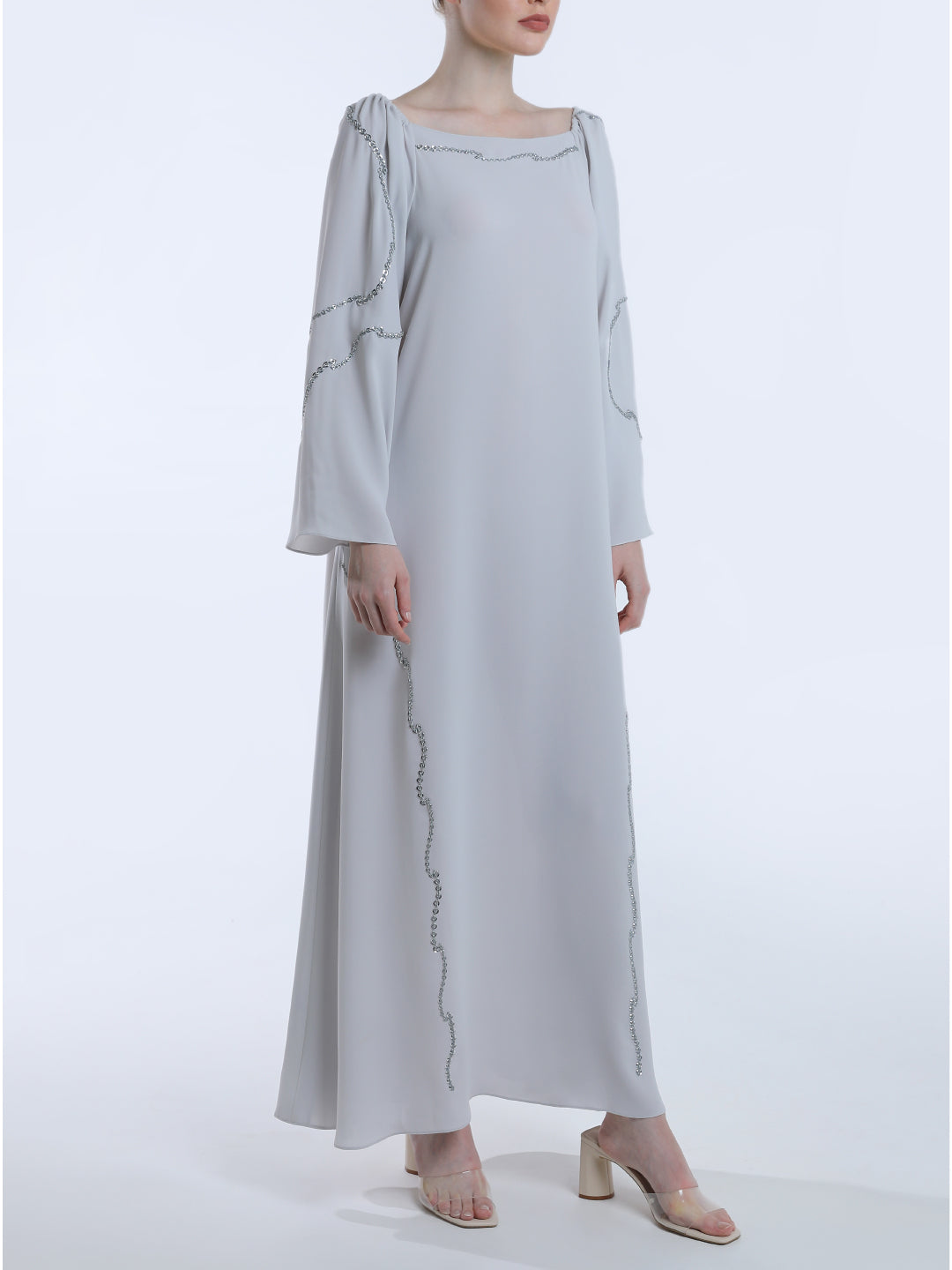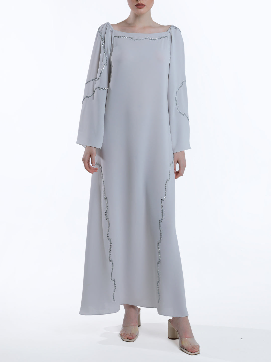 A wide neckline Kaftan with long bell shape sleeves. Signature crystal and thread woven embroidery
