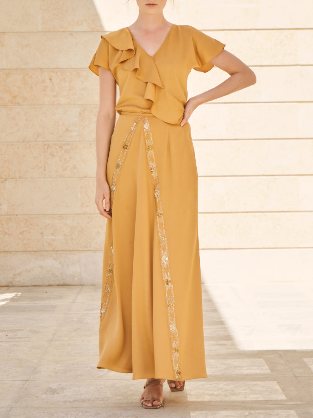 A ruffle detailed top paired with an A-line skirt with gold hand embordairy