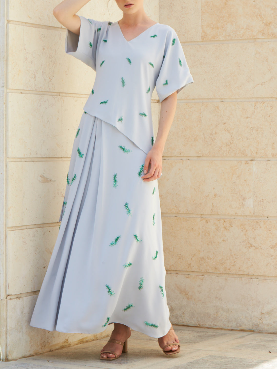 A box pleat skirt with green hand embordairy paired with a matching top