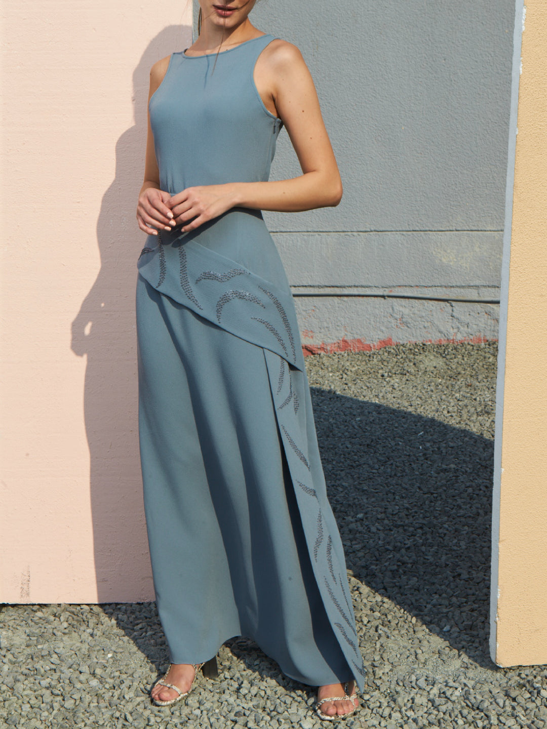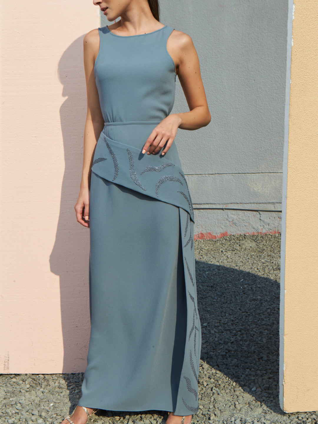 A sleeveless top paired with a pencil skirt with hand embroidery details