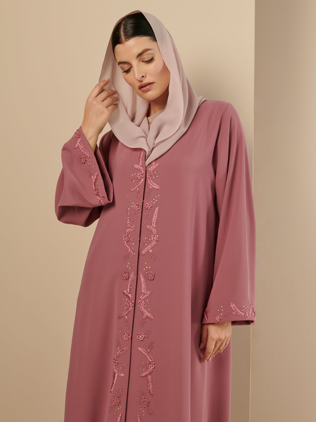 A crepe abaya with hand embroidery dandelion flowers embroidery on the front side and sleeves paired with Sheila. Other color options available