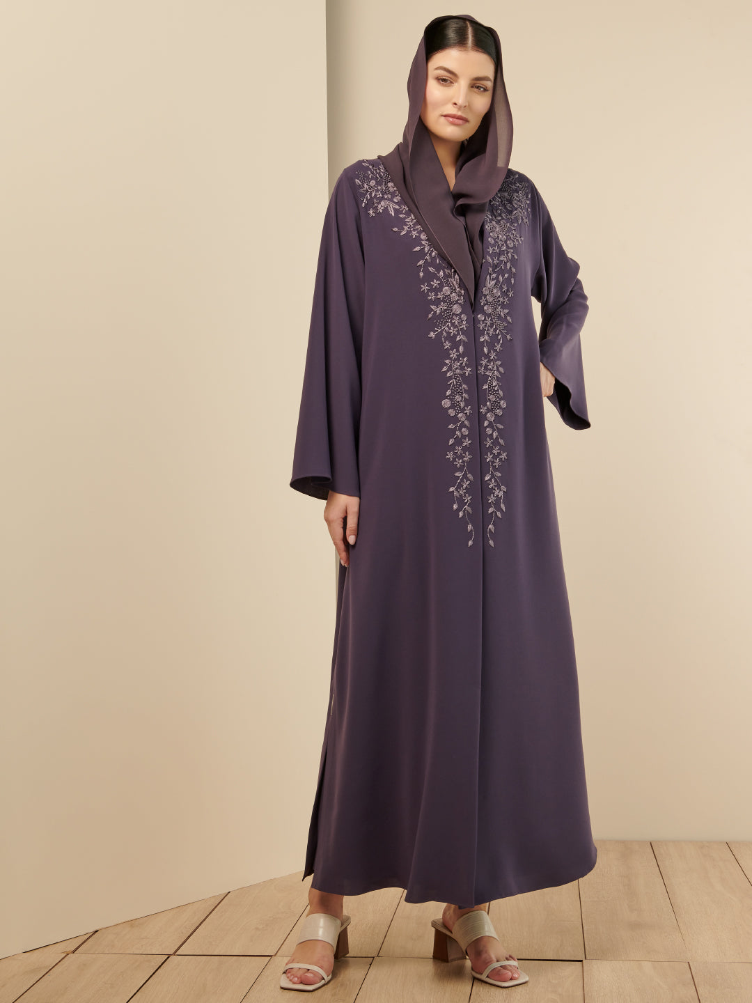 A crepe abaya with hand embroidery flowers on the shoulders paired with Sheila. Other color options available