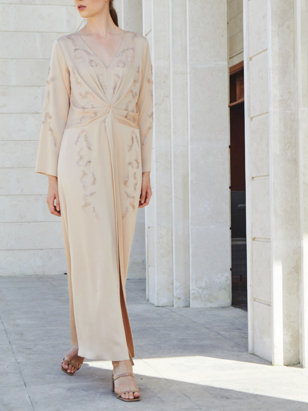 A long kaftan with knot detail on the waist with signature embroidery