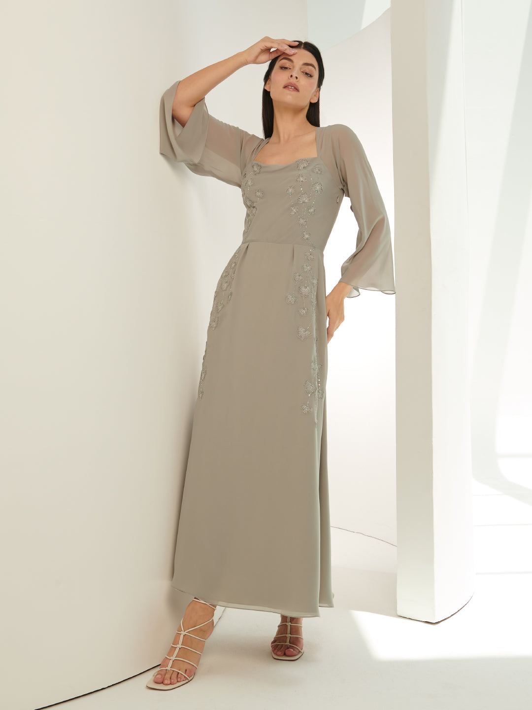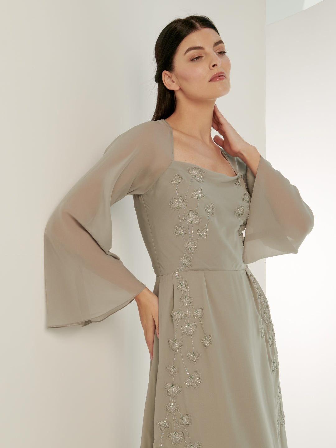 A chiffon halter evening dress with bell sleeves and metallic hand embroidery cutout flowers. Other color options available