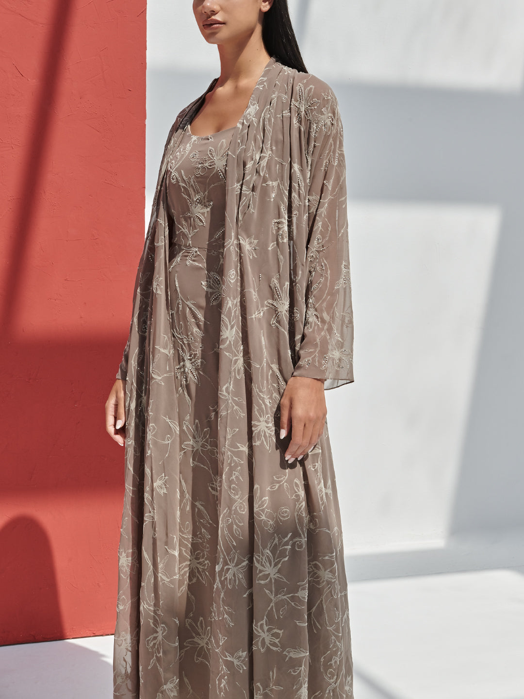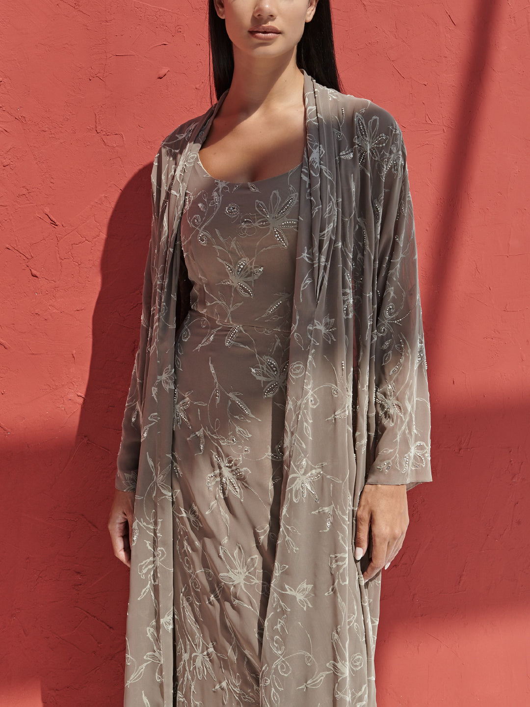 A Japanese flower chiffon cardigan with intricate hand embroidery in pearls and can be worn as an Abaya. Inner dress option is FW-2022-18