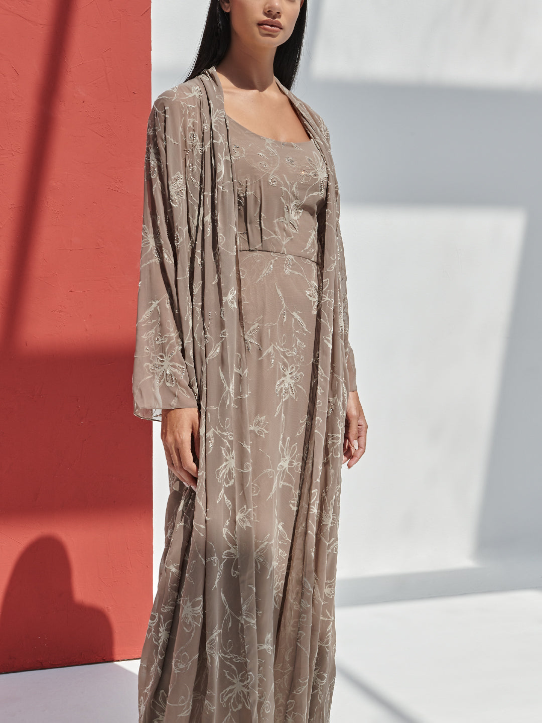 A Japanese flower chiffon dress with intricate hand embroidery in pearls