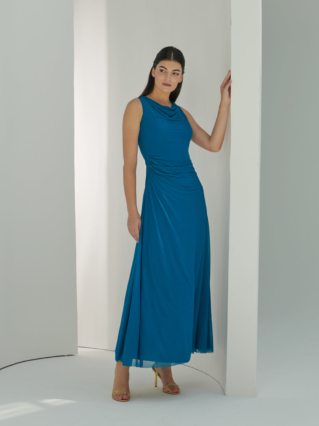 A draped neckline in light Japanese knit dress with draping on the hips.
