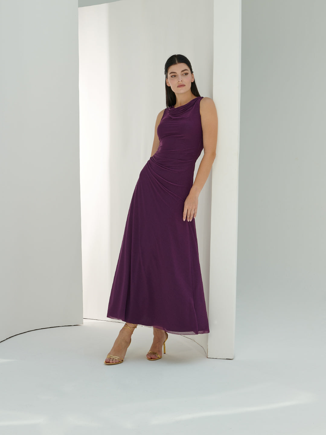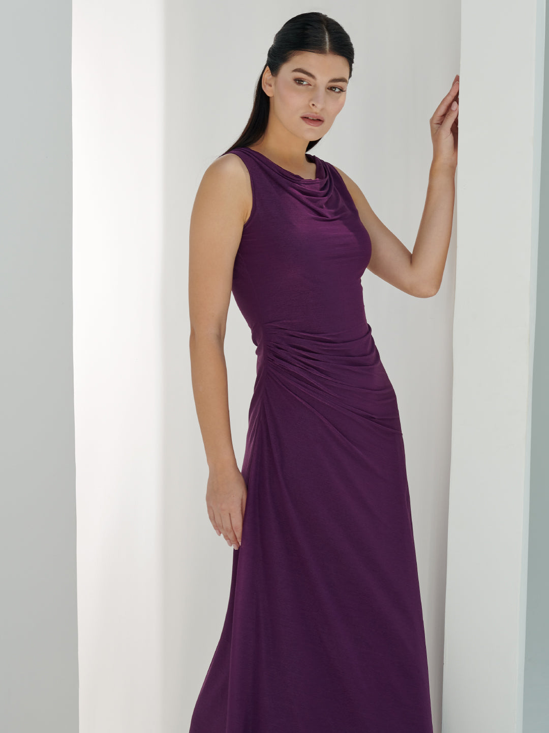 A draped neckline in light Japanese knit dress with draping on the hips.