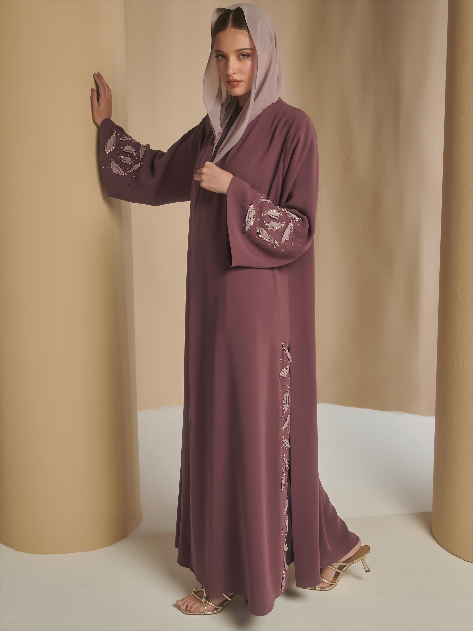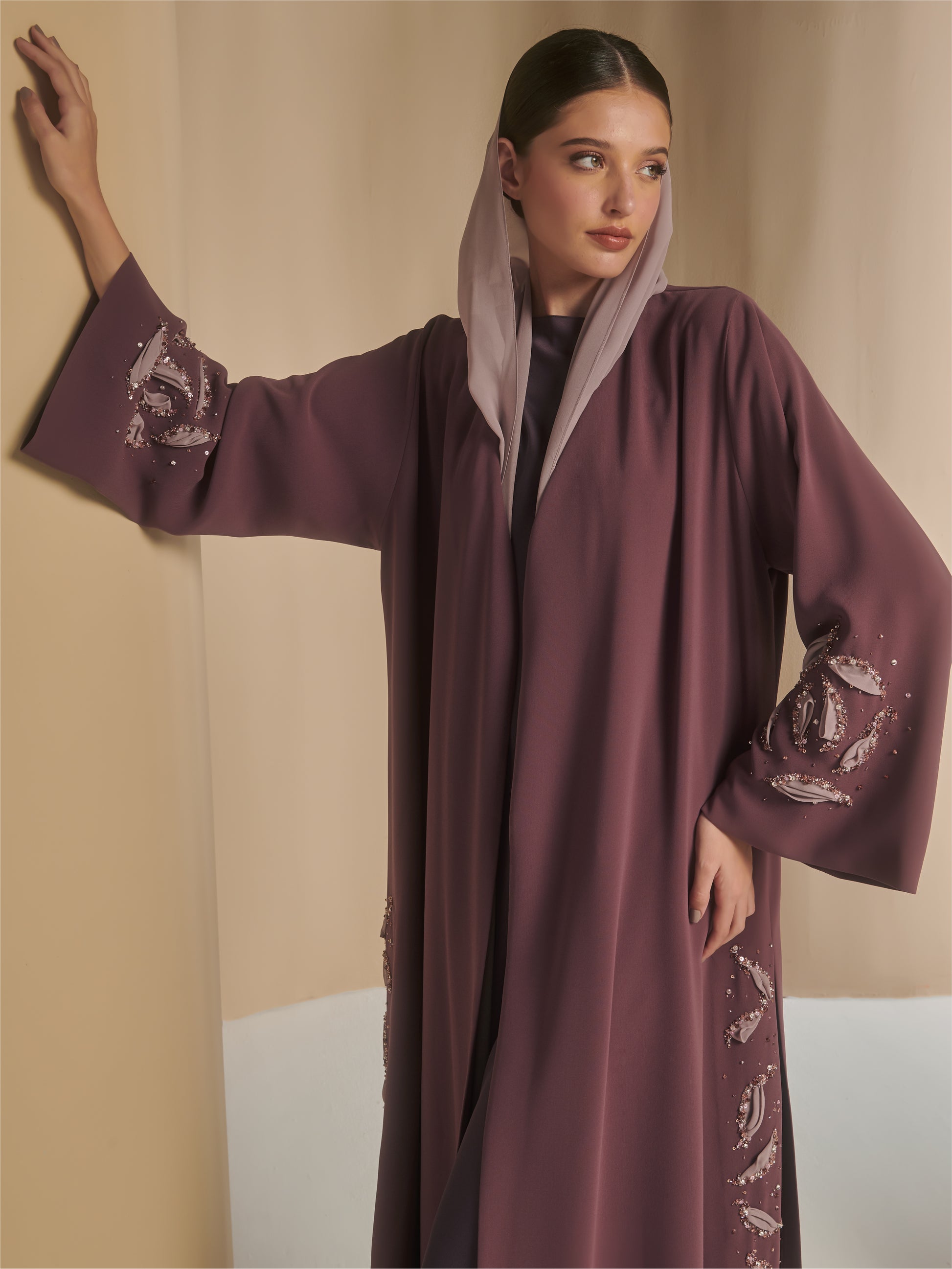 A crepe Abaya with hand pleated flowers with embroidery on the sides of the abaya and sleeves