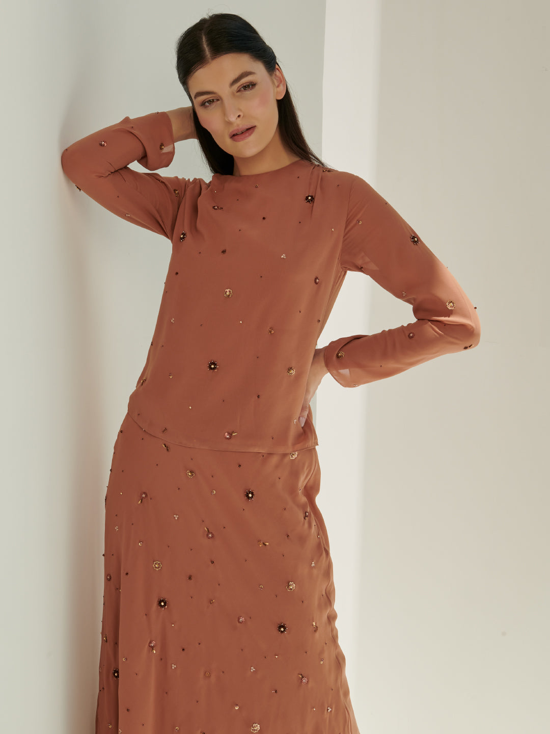 A chiffon long sleeves top paired with a matching skirt with full hand embroidery. Other color options available