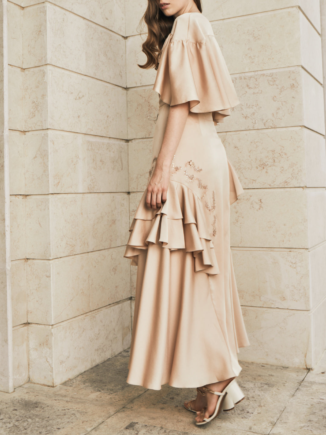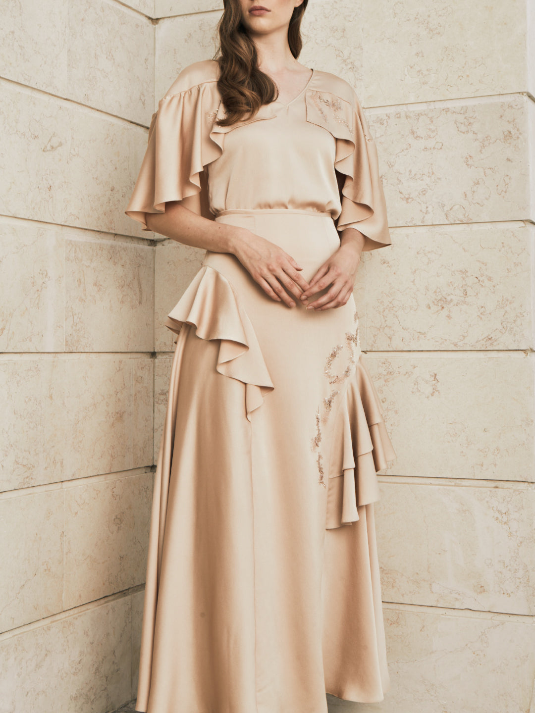 A dramatic layered top pair with a matching skirt with hand embordairy