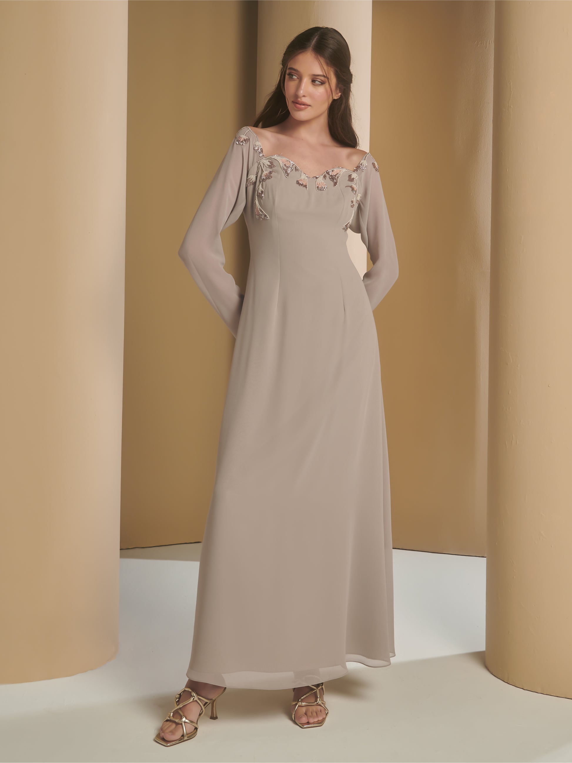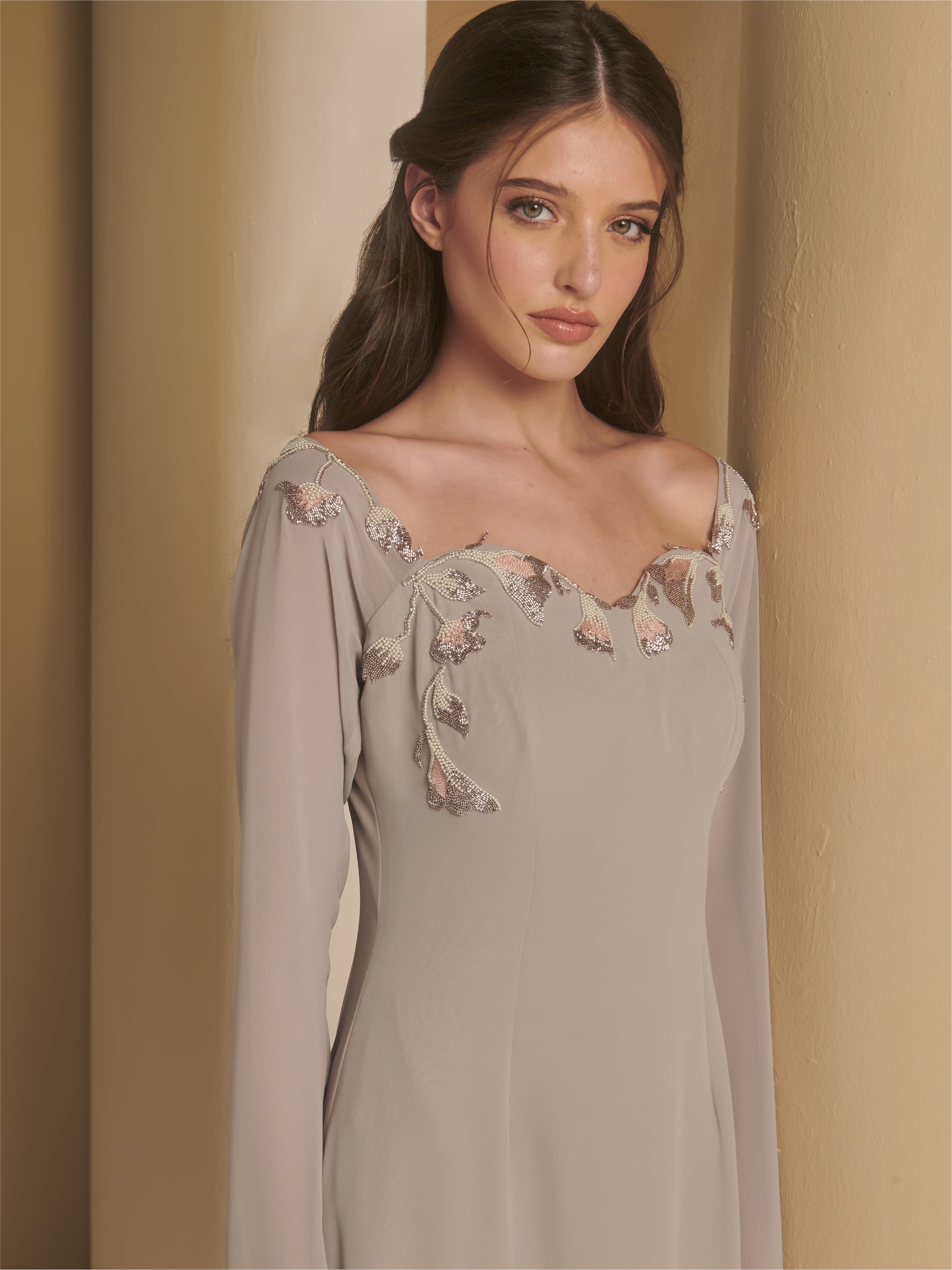 A chiffon bouquet of tulips and pearls details embroidered around the neckline