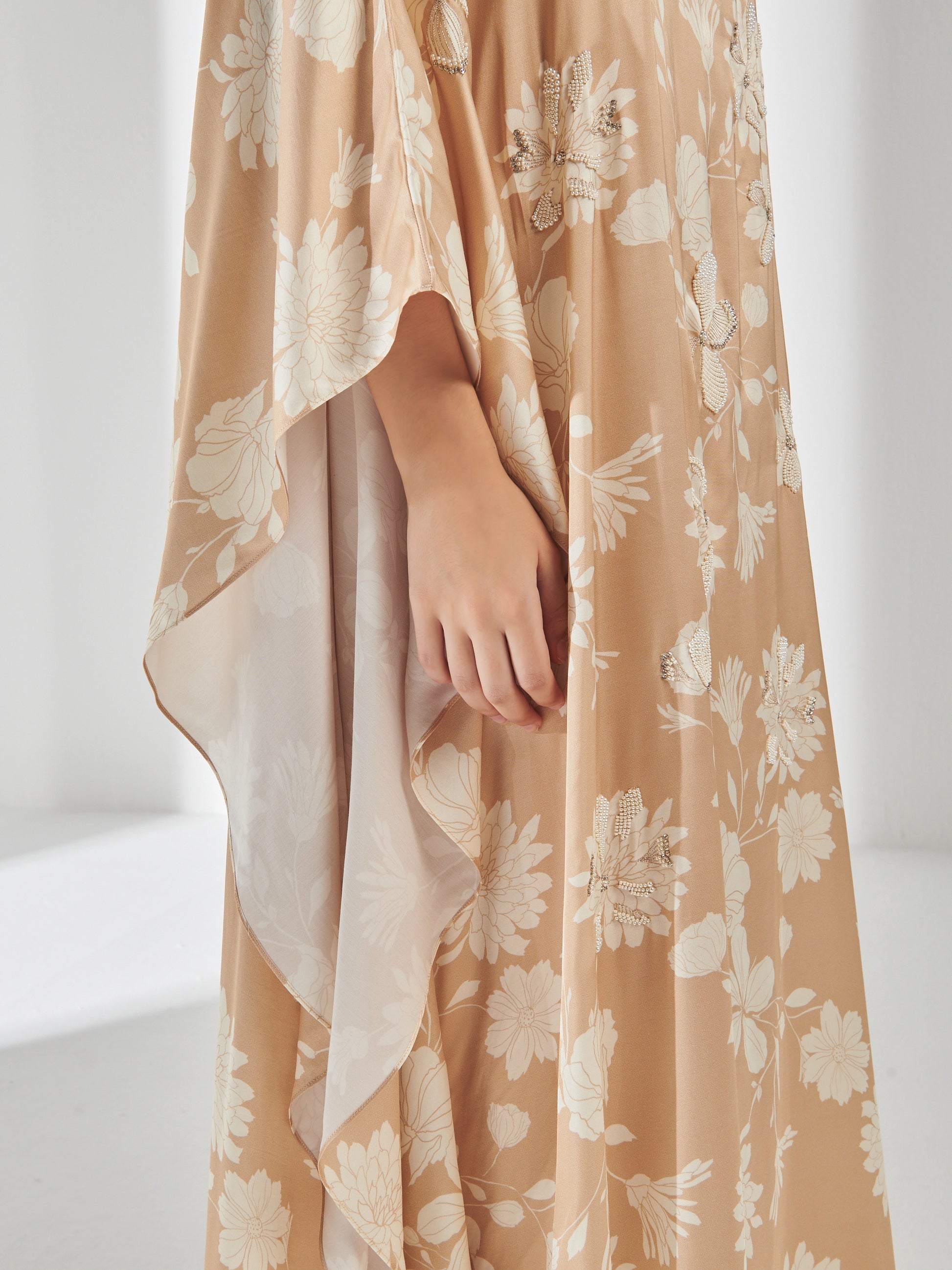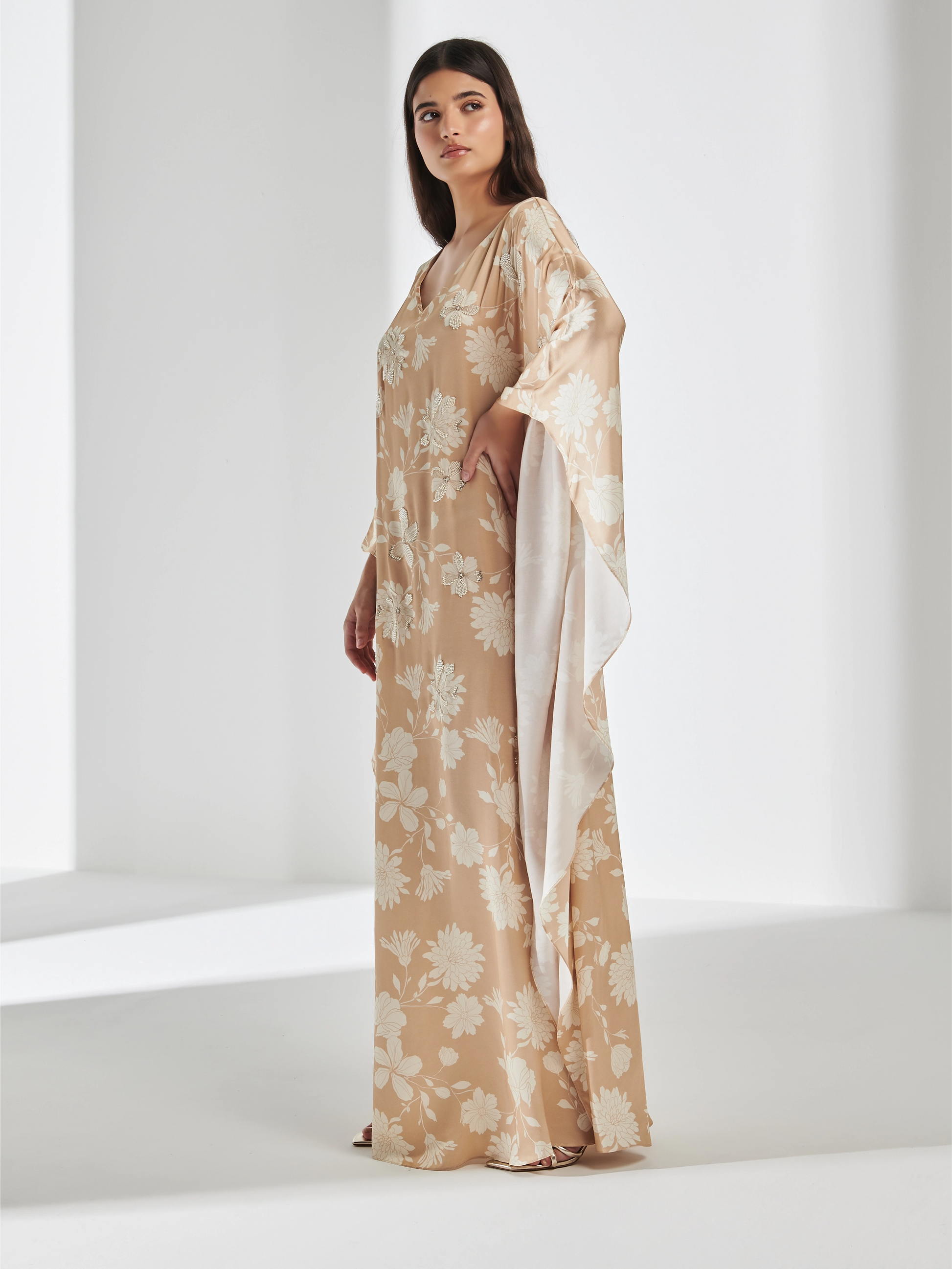 A French silk kaftan dress in crème with monochromatic print with pearl hand embroidery details.