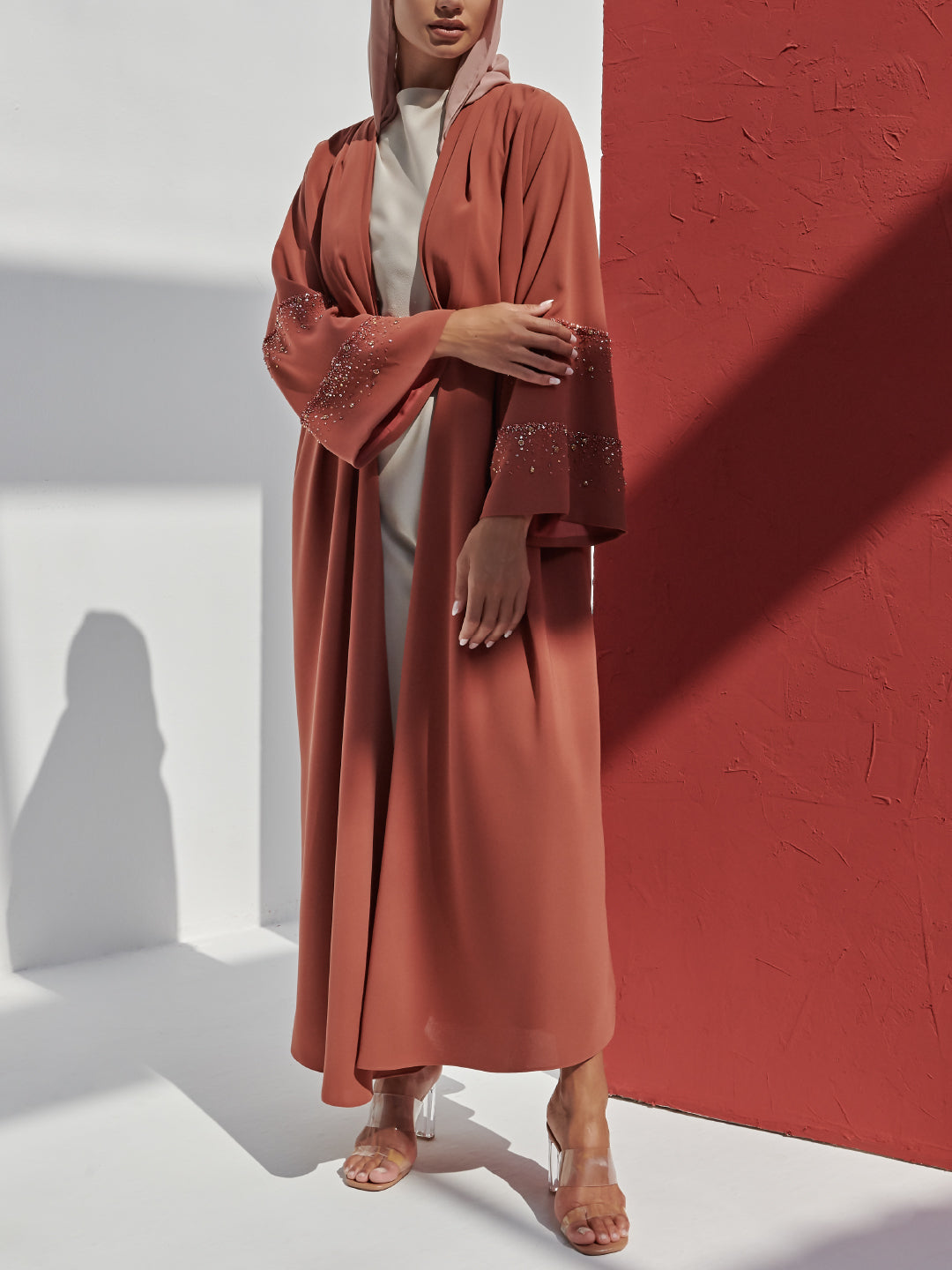 A crepe abaya with season signature collar with metallic hand embroidery details on the sleeves. Other color option available
