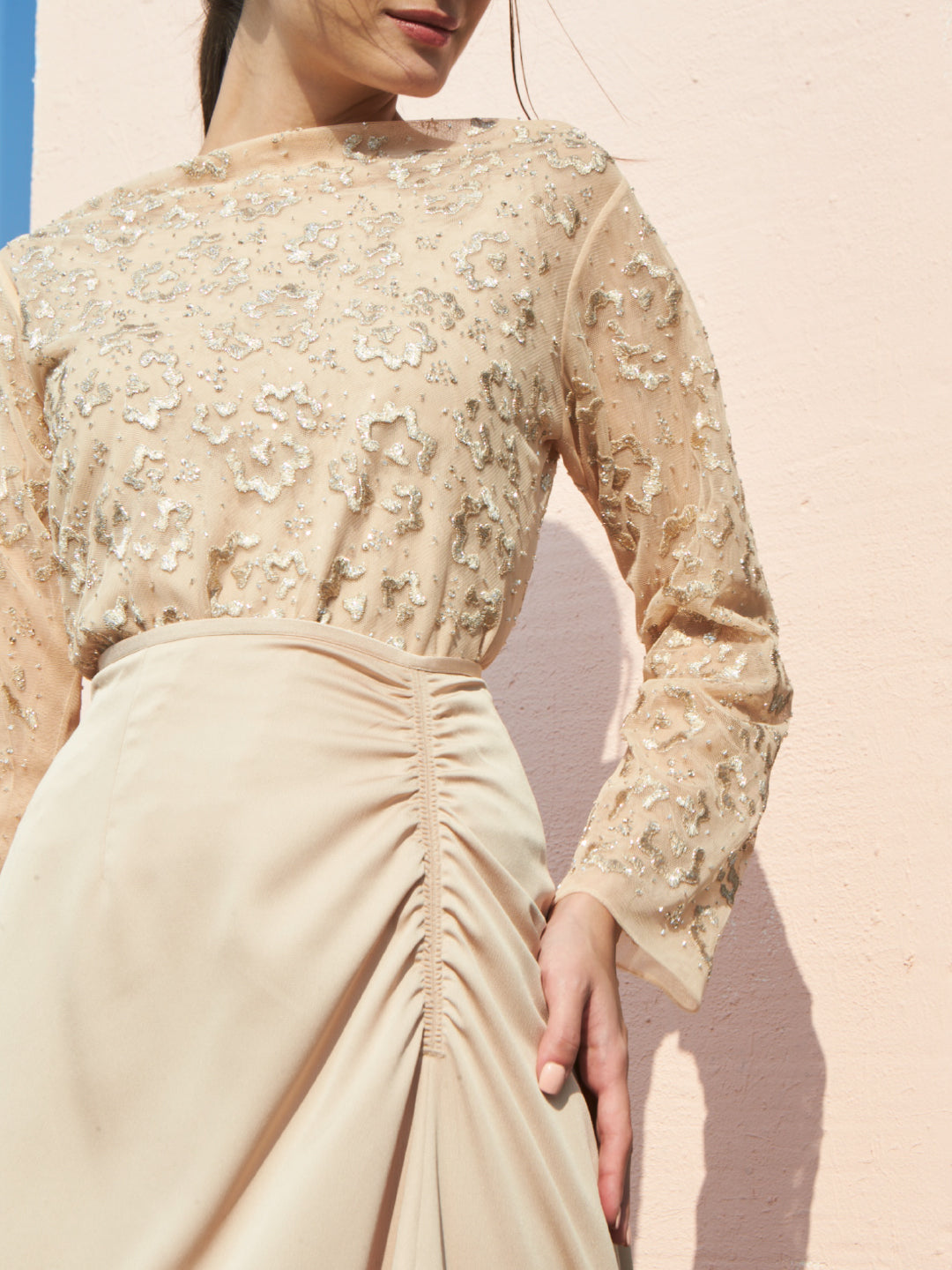 A draped tulle top with hand embroidery details paired with silk crepe A-line skirt