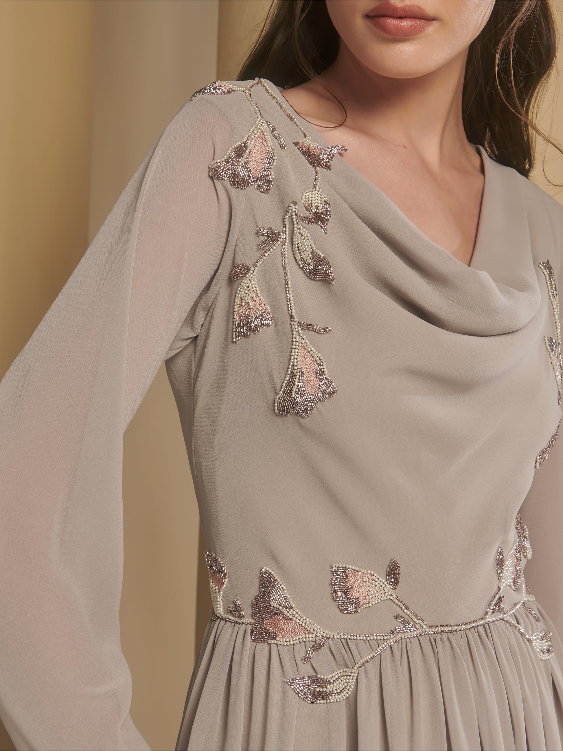 A chiffon cowl neckline dress with hand embroidery tulips and pearl details