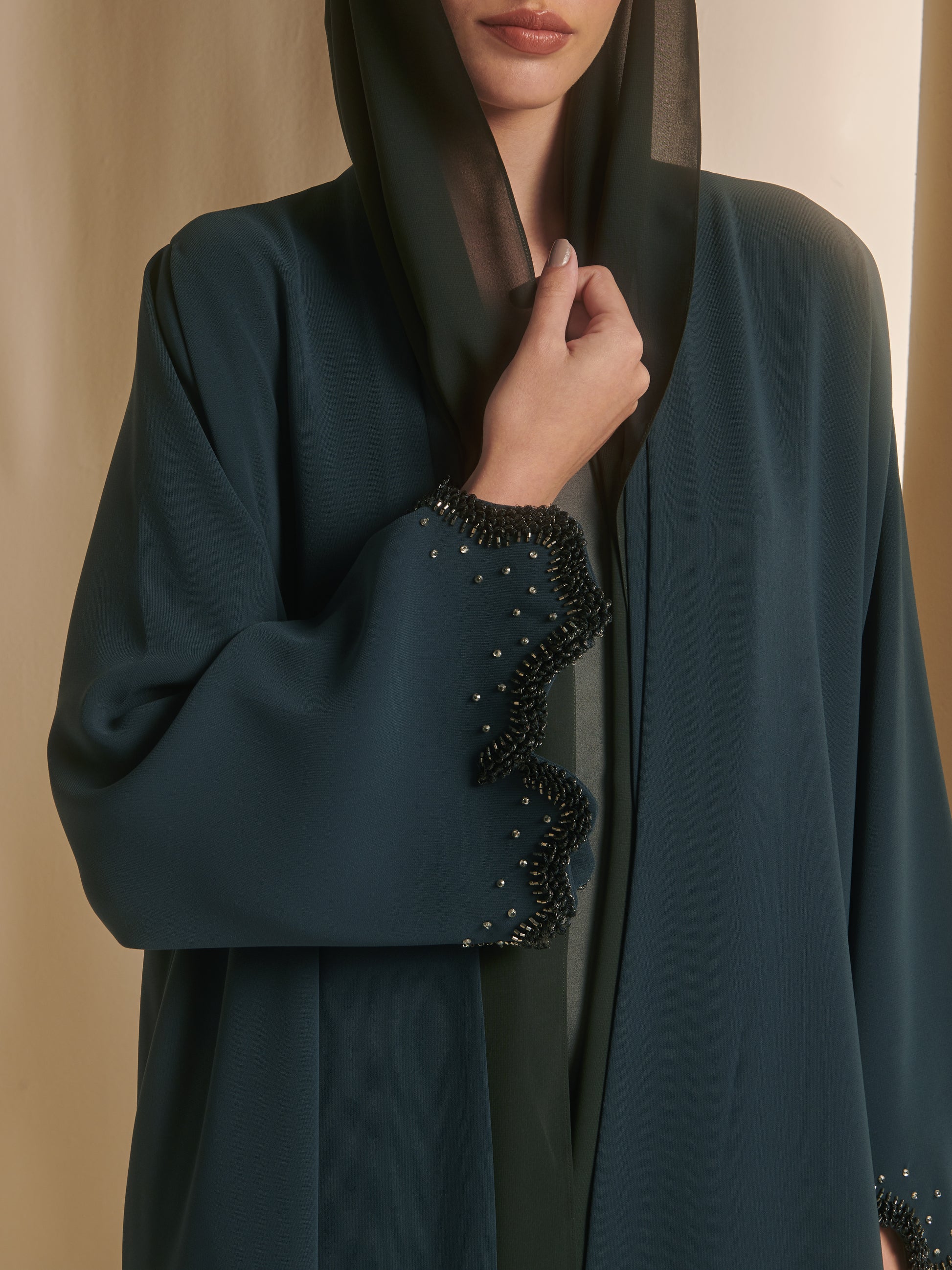 A crepe abaya with scallop cut sleeves details embroidered with 3D threads
