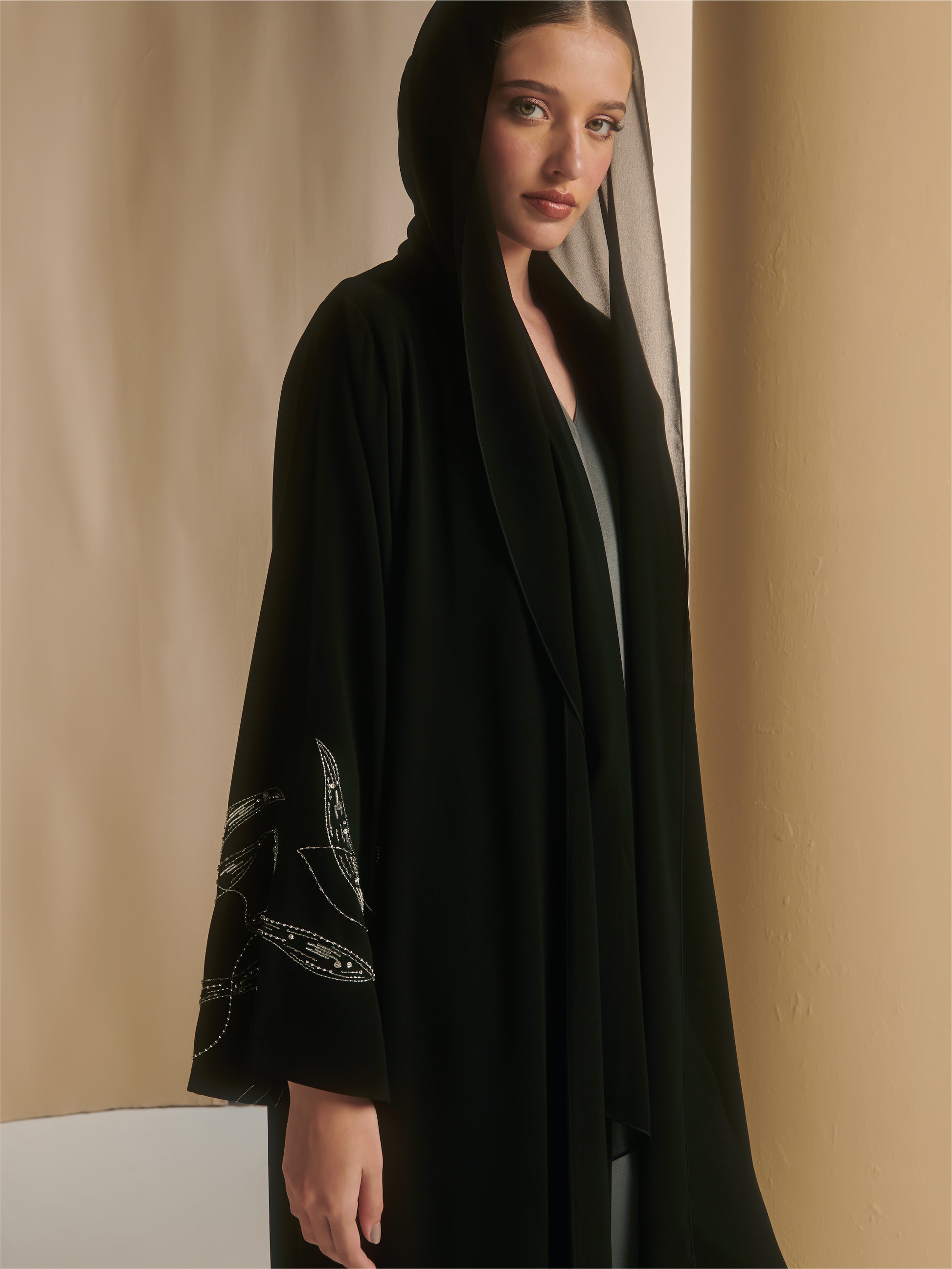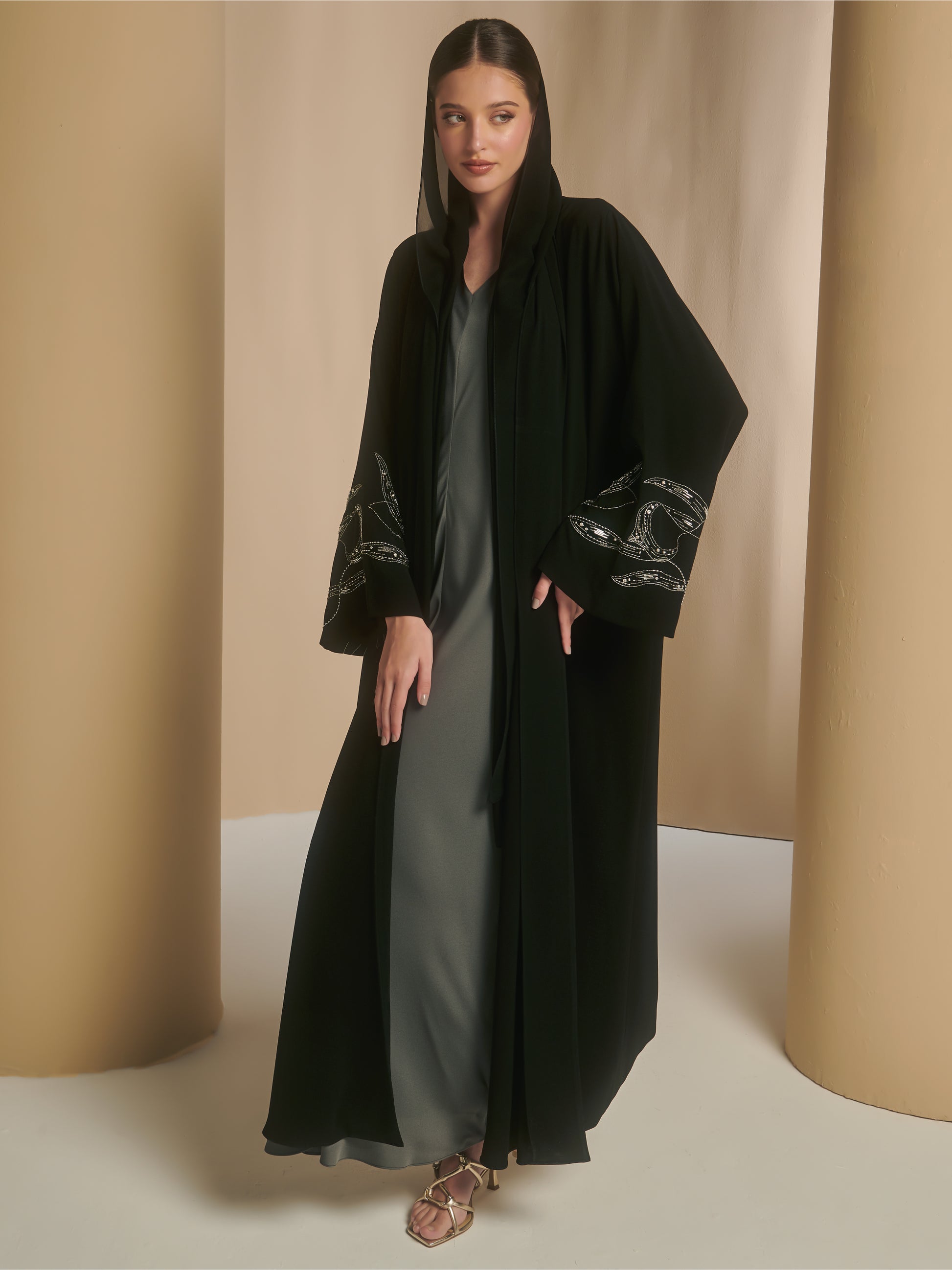 A crepe Abaya with silver folds pattern reflecting wind in hand embroidery on the sleeves