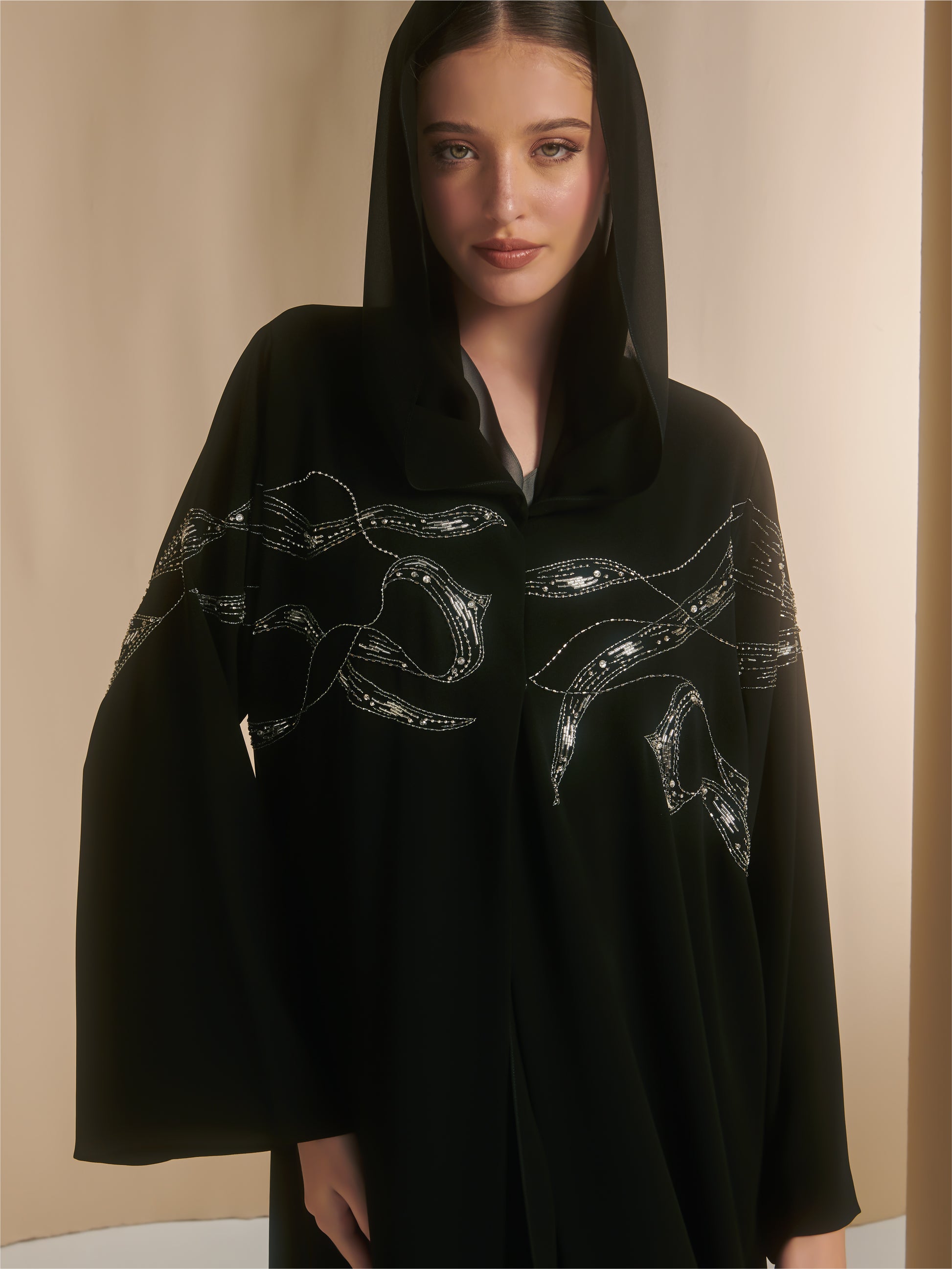 A crepe Abaya with silver folds pattern reflecting wind in hand embroidery placed on the front side of the abaya
