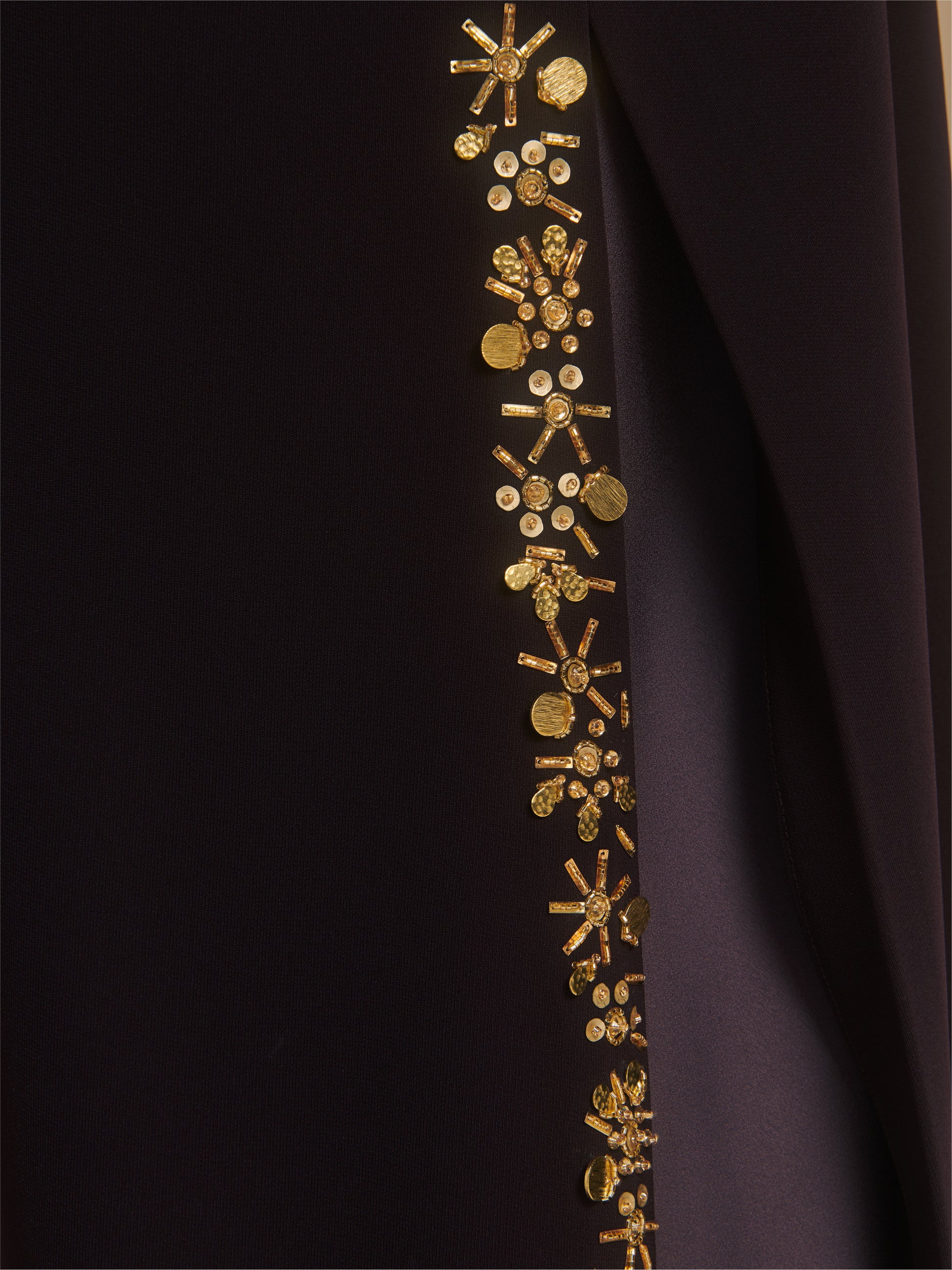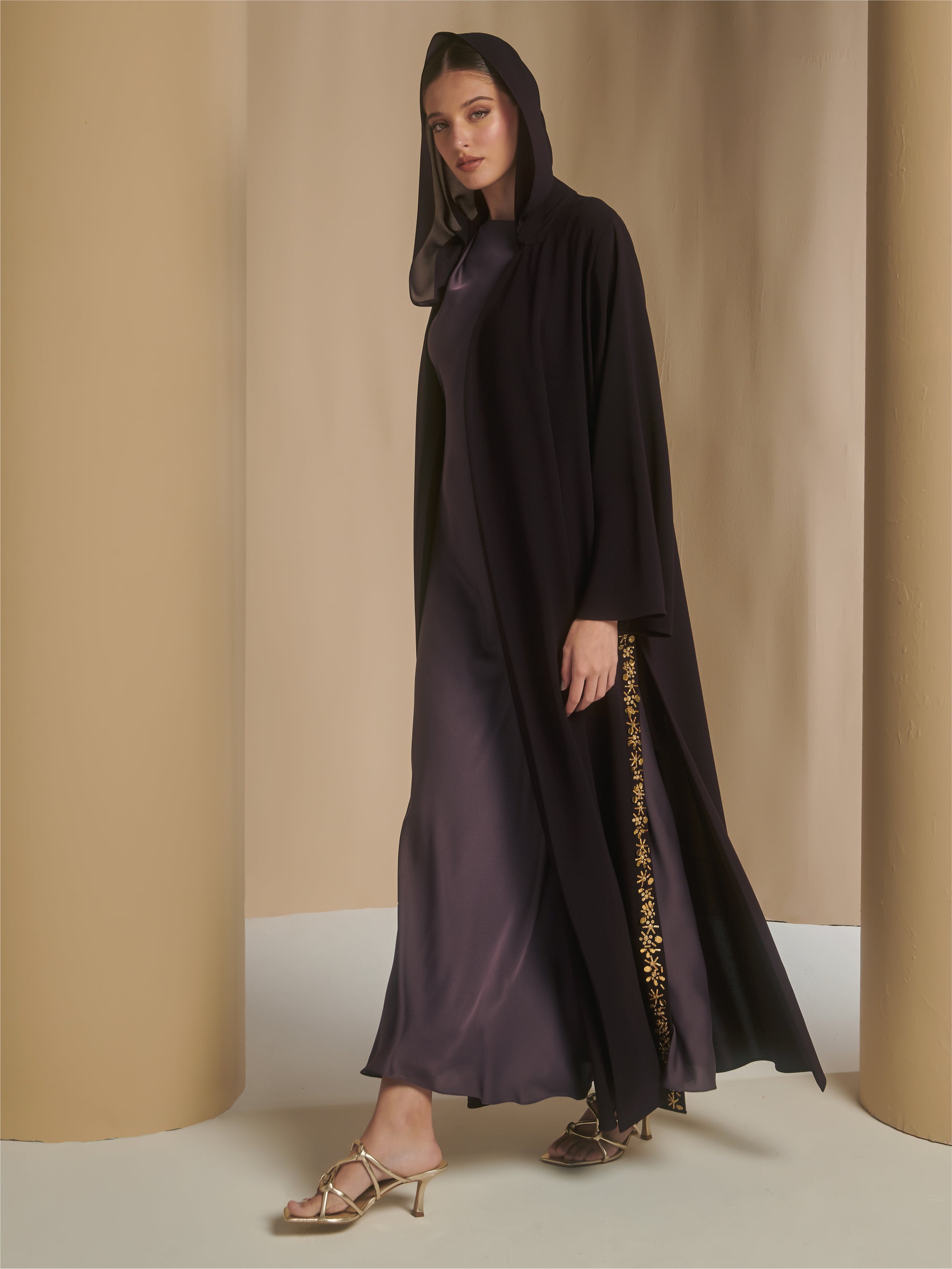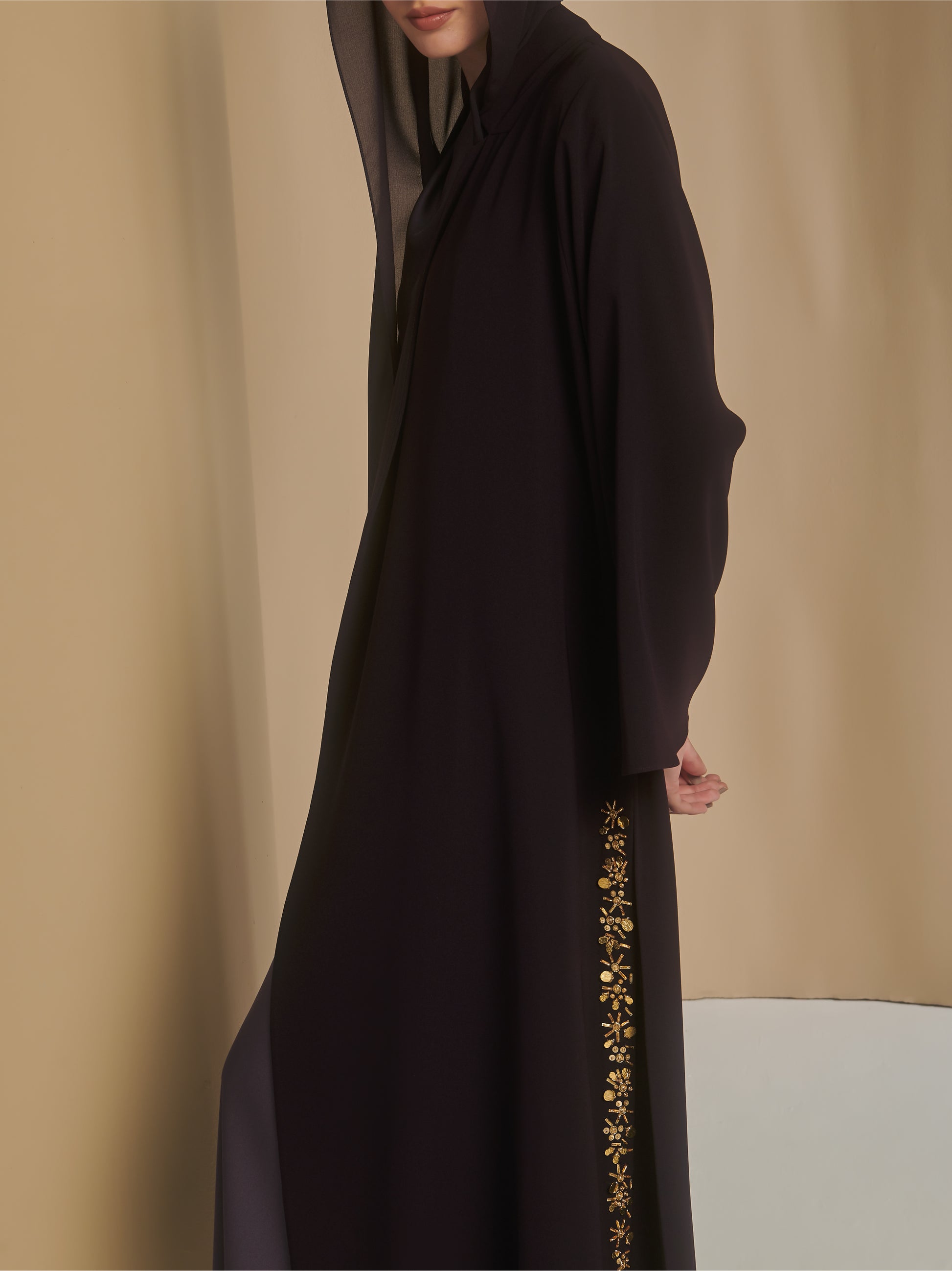 A crepe Abaya with gold hand embroidery details on the sides of the abaya