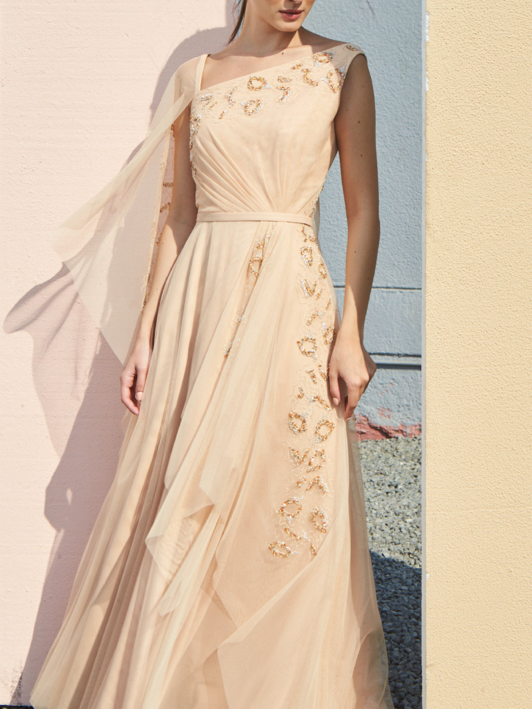 An off shoulder tulle evening gown with intricate hand embordairy details