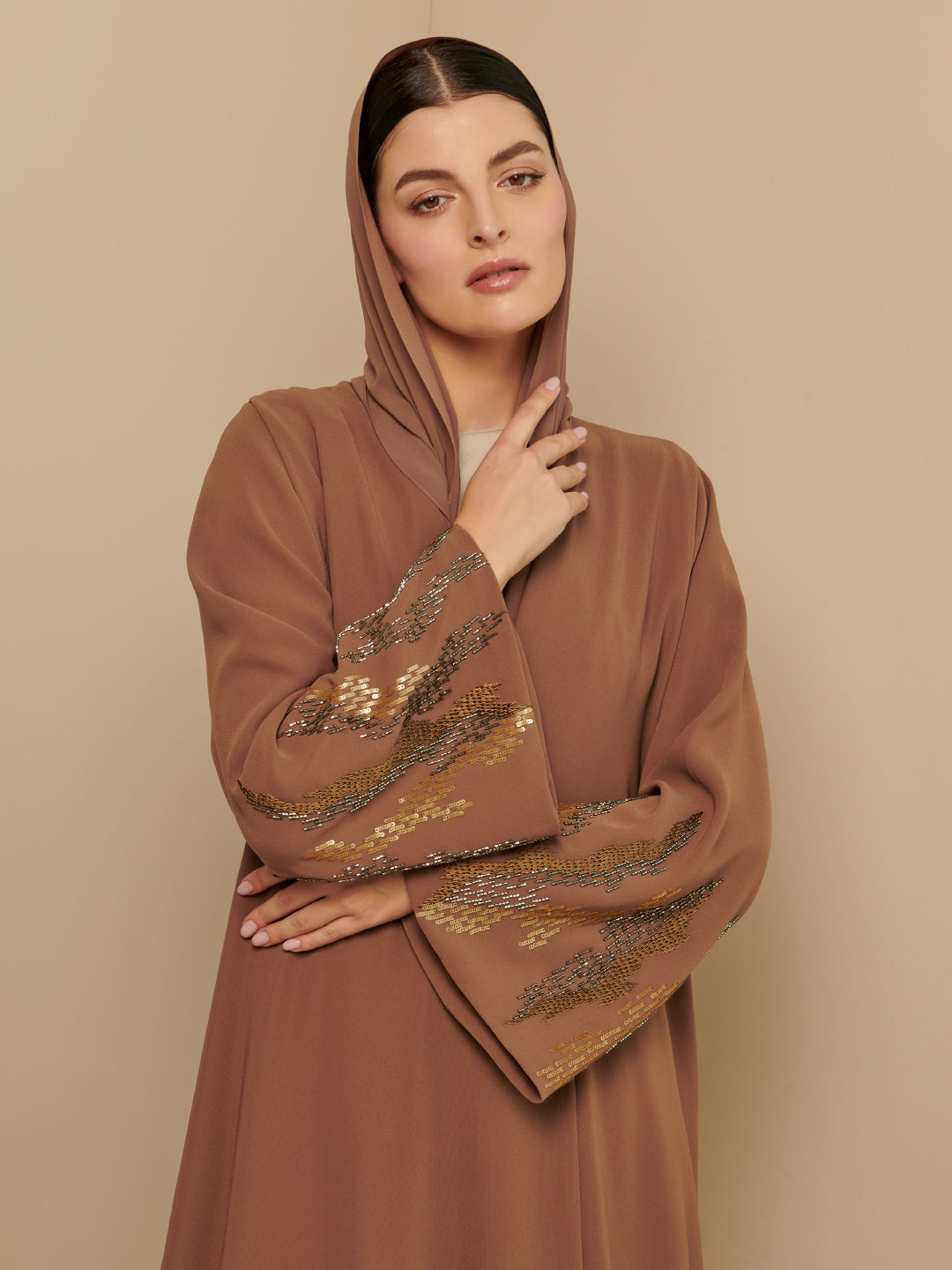A crepe abaya with ombre golden hand embroidery on the sleeves paired with Sheila. Other color options available