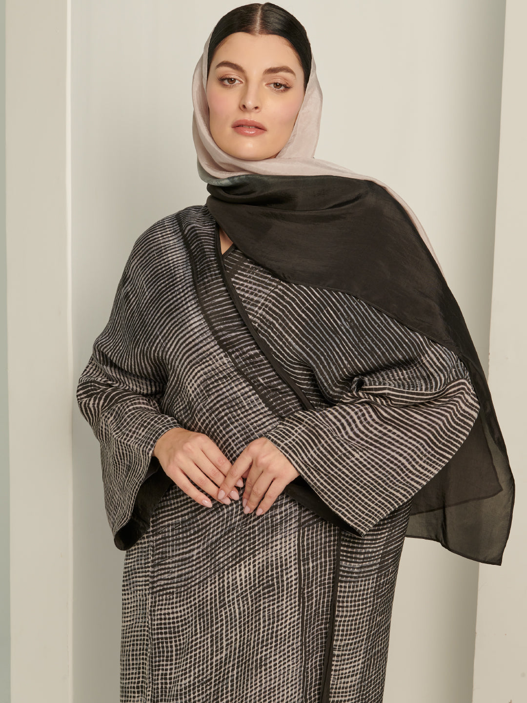 A 2-set silk shabori print Abaya in black and white matched with ombre Sheila