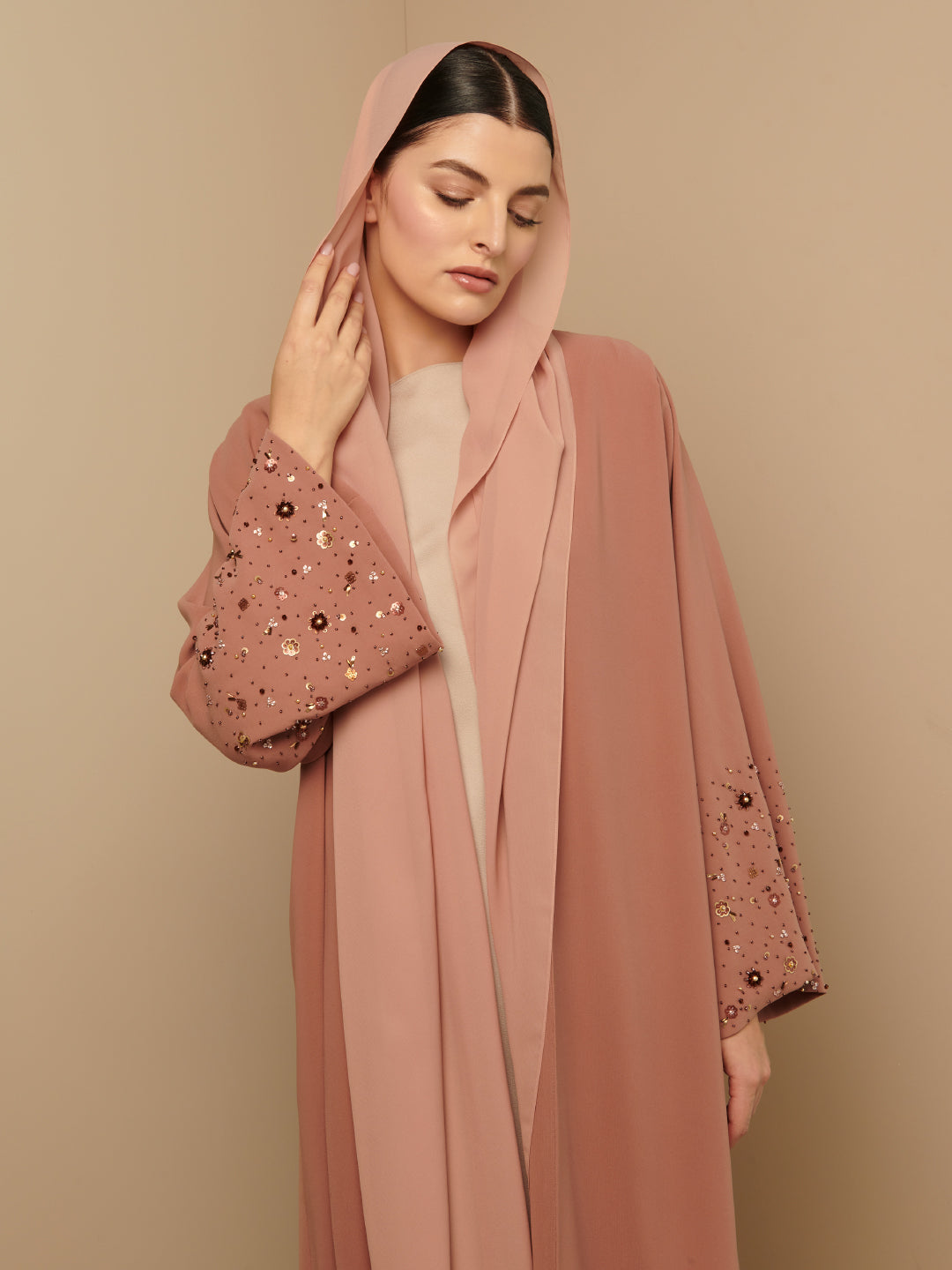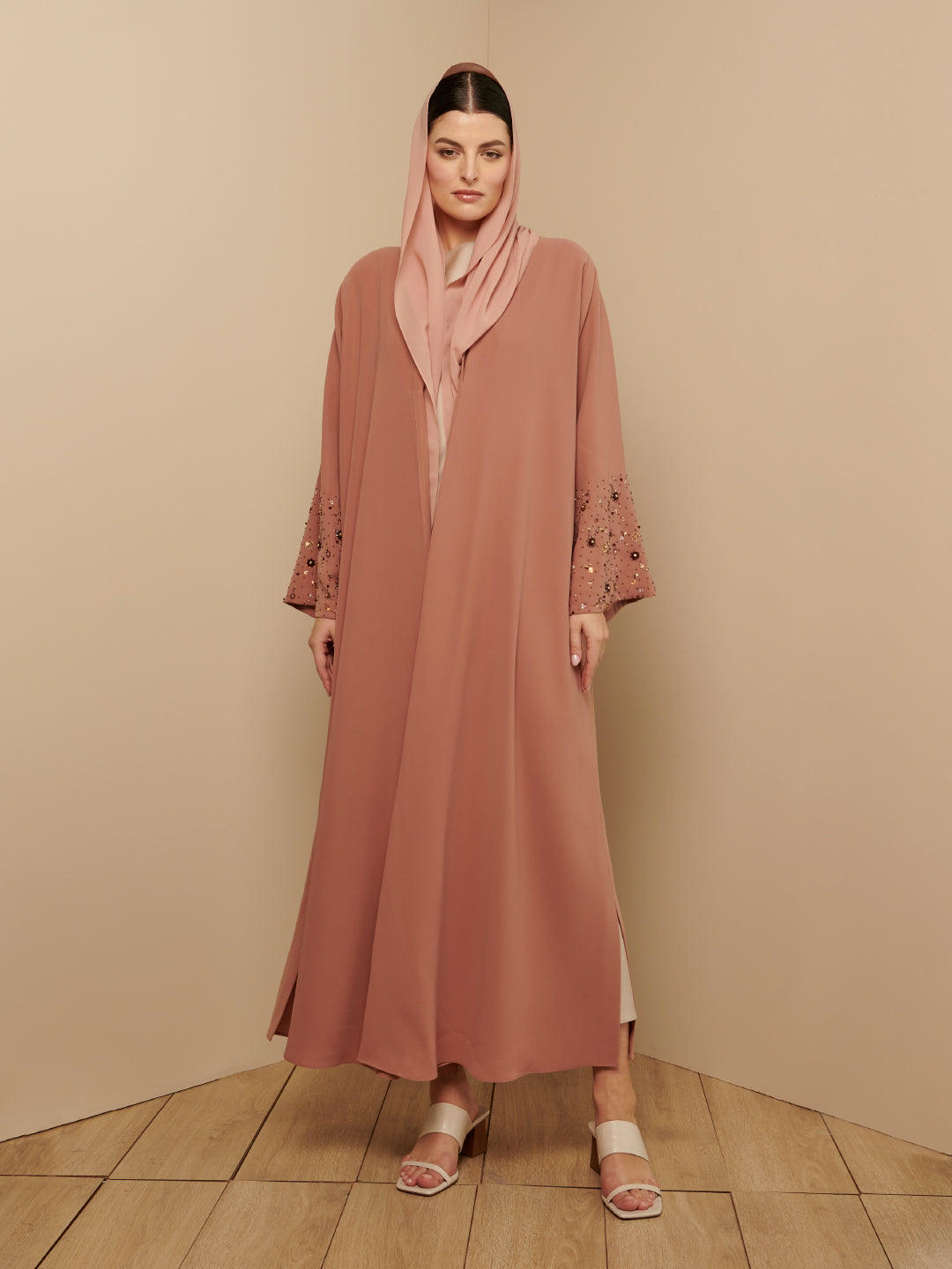 A crepe abaya with hand embroidery on the sleeves paired with Sheila. Other color options available