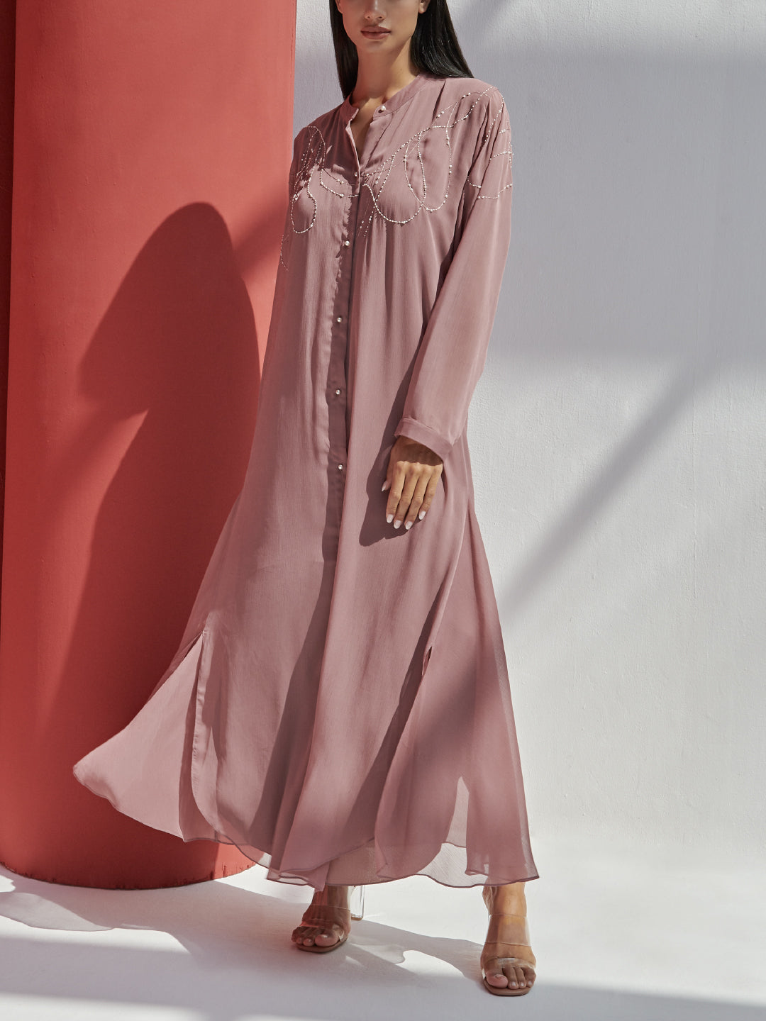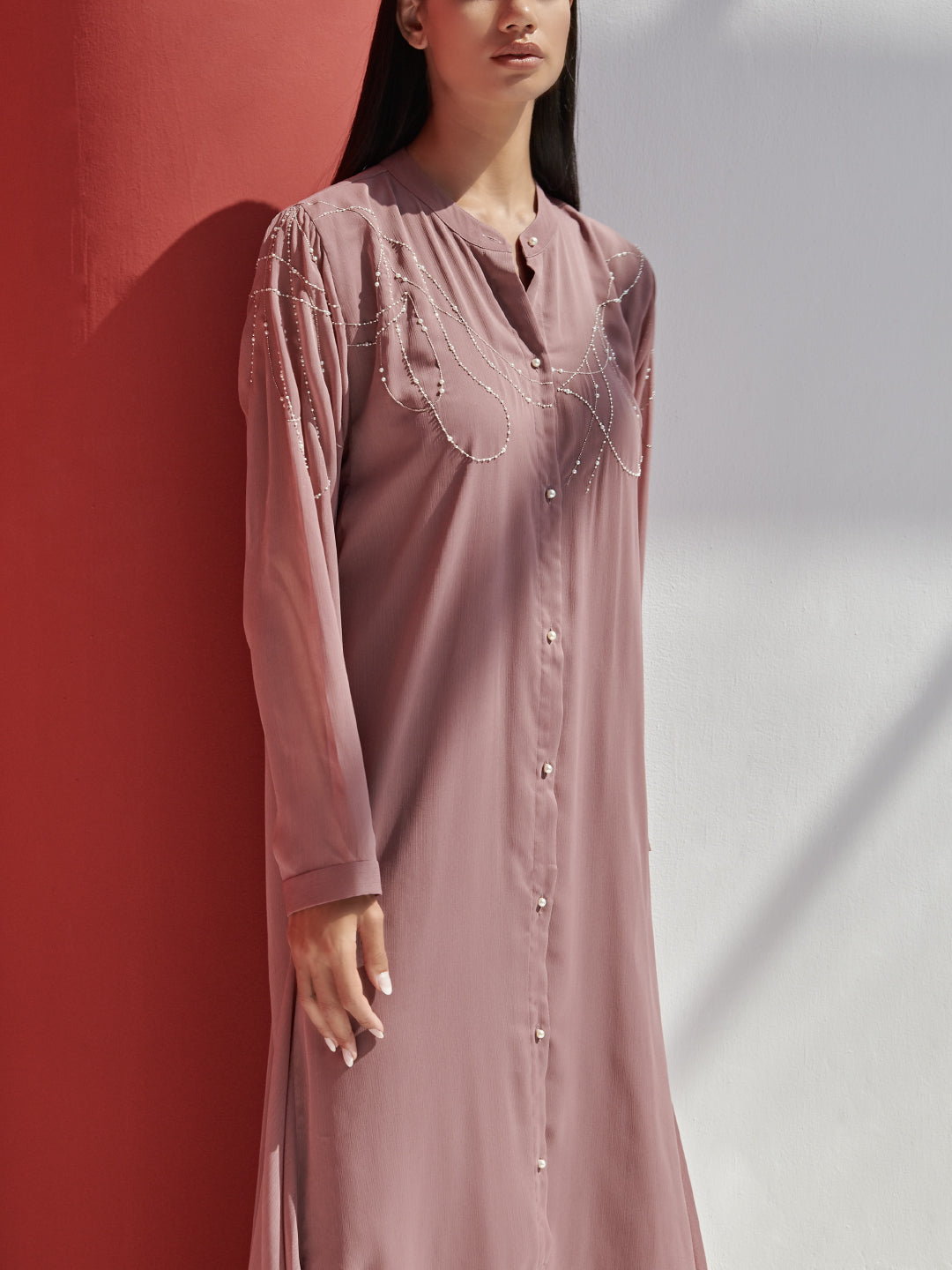 A chiffon dress with pearl chains hand embordairy. Other color option available