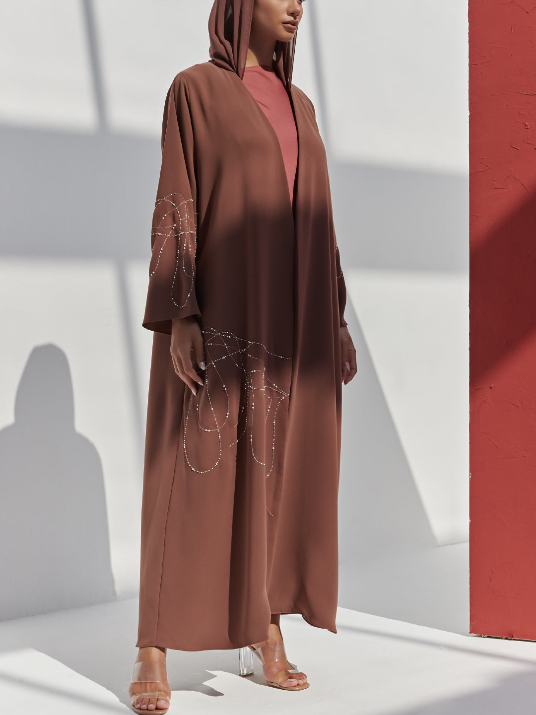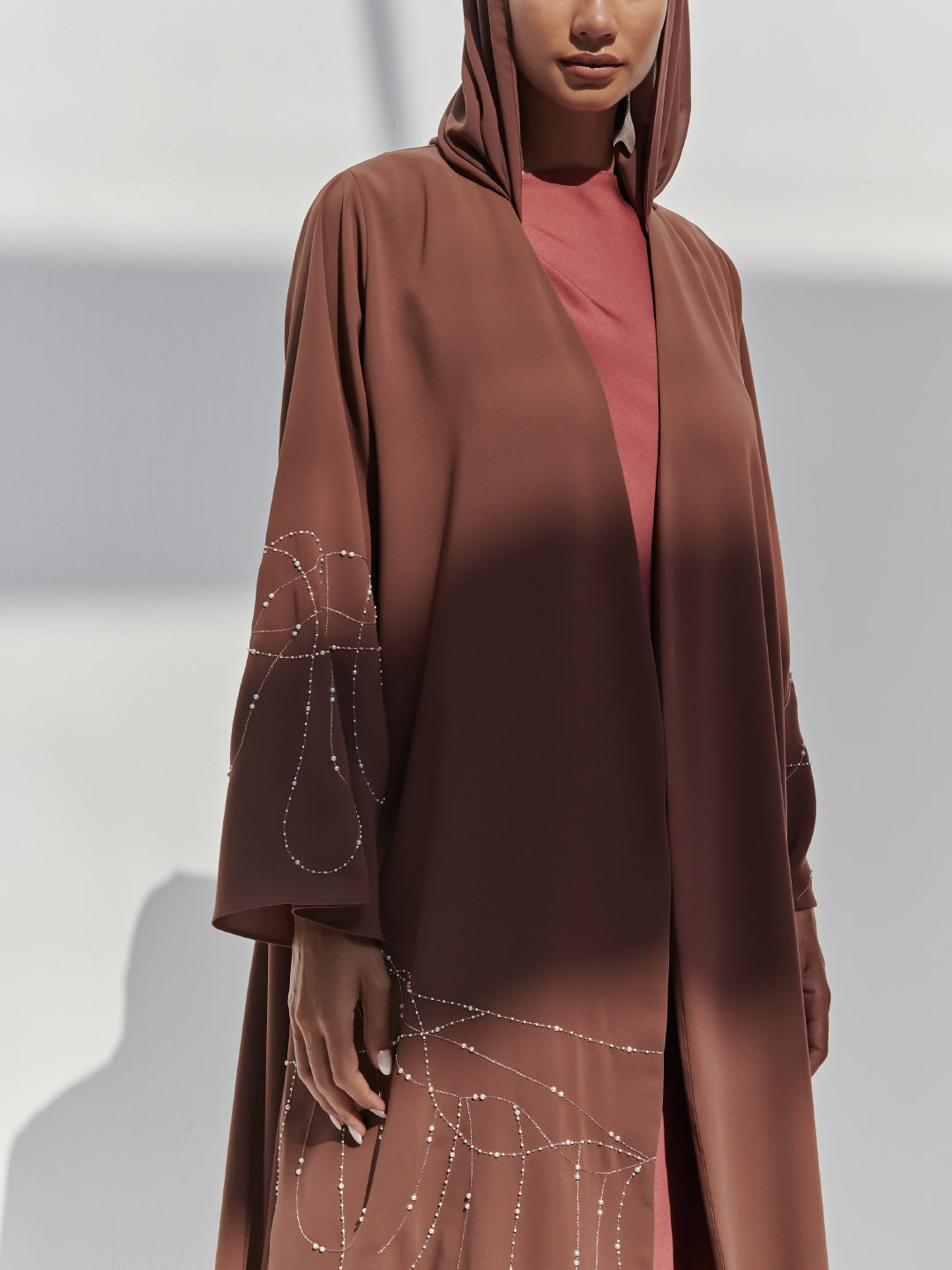 A crepe abaya with season signature collar with pearl chains hand embordairy details on the sleeves and sides. Other color option available