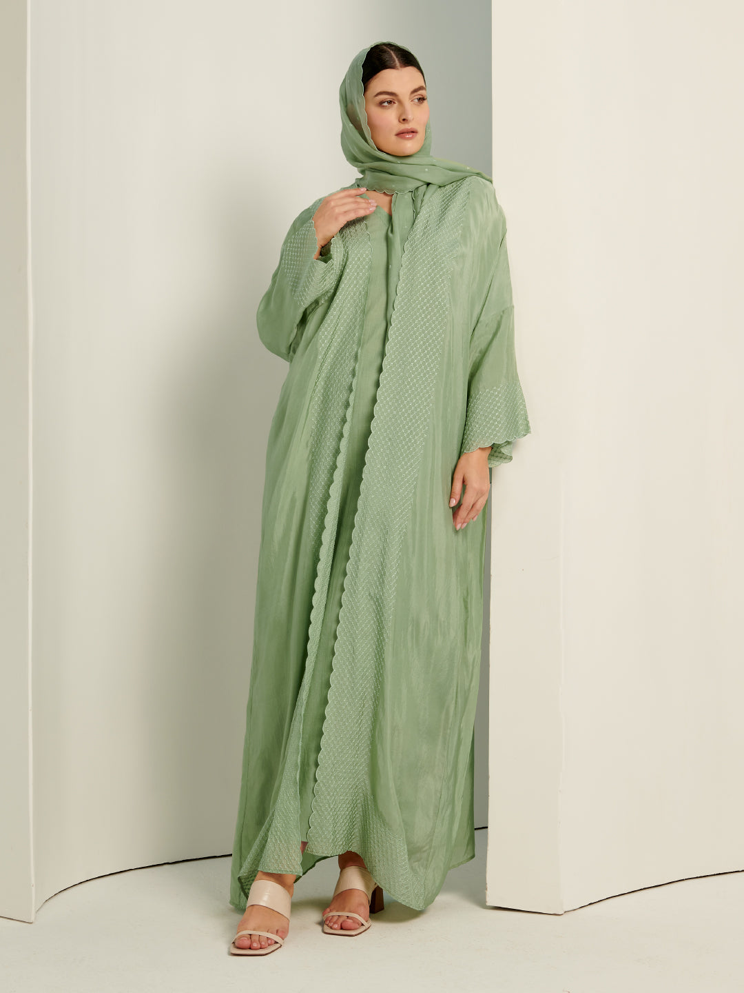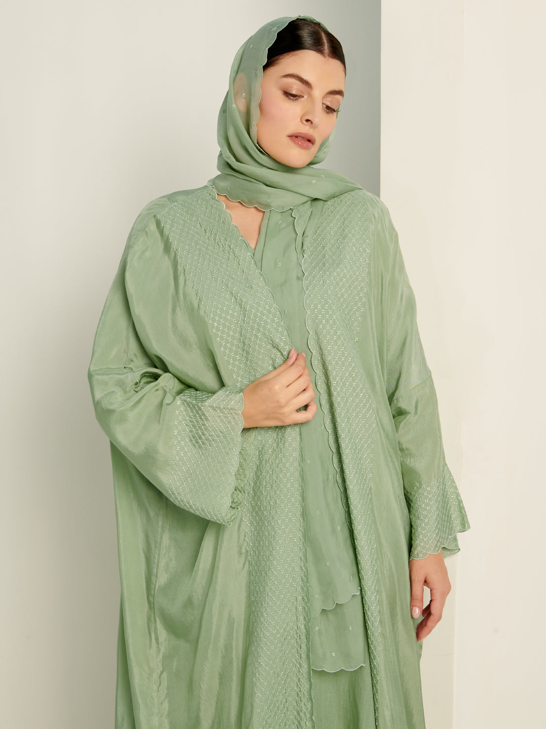 A 3-set silk abaya with hand stitched details on the abaya and Sheila paired with cotton inner dress