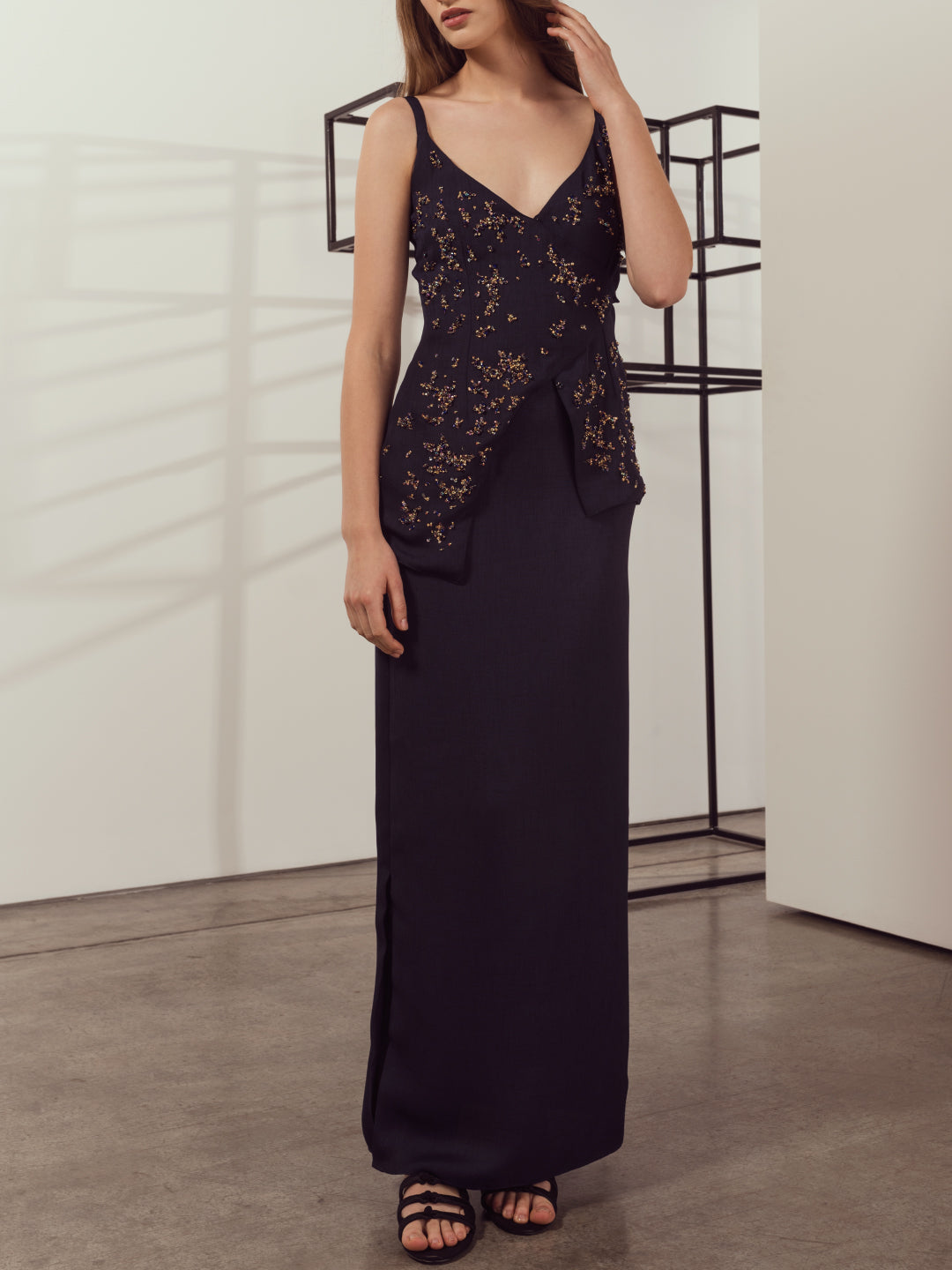 Plunging neckline top paired with a matching pencil skirt in textured deep blue crepe. The top is fully embellished with hand embroidery with the shades of gold, electric blue and multi colors.